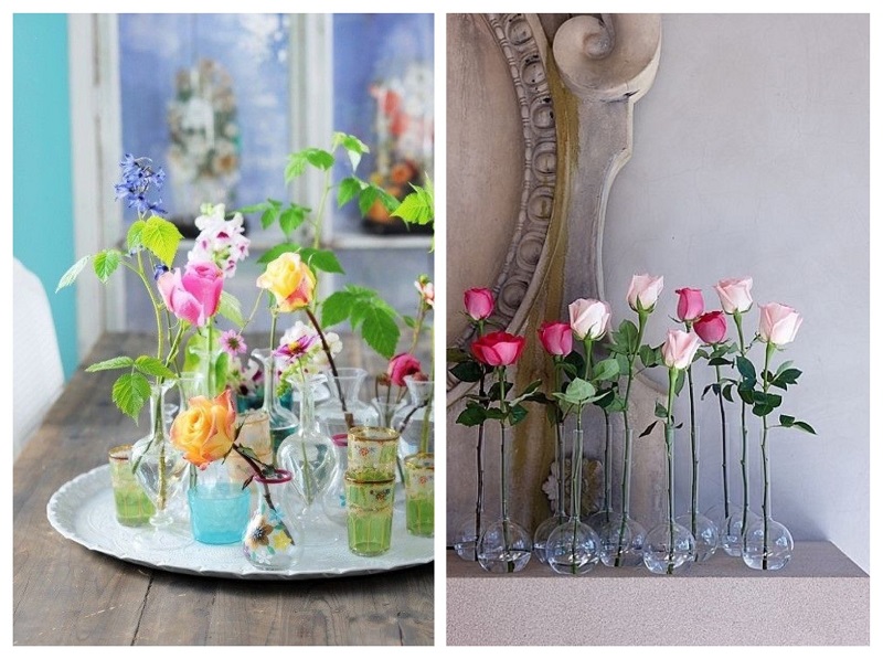 Очень мне нравится идея разбить один букет по нескольким вазам. Получившийся цветочный ряд можно поставить на подоконник или полочку, соединив «одиночек» в прекрасную гармоничную «семью».