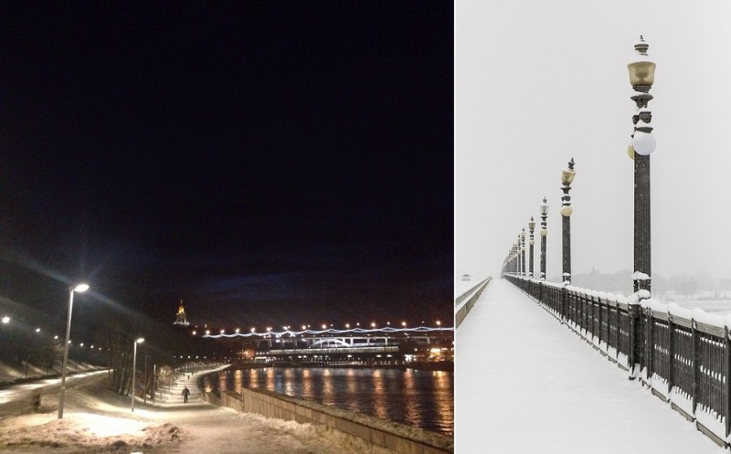 На набережной холодно. Бетон и асфальт перетекают в кованую оградку, за которой воздух — вертикально вниз, к реке. Греешь руки в карманах. Неспешно идёшь, ловя взглядом редкие парочки, выбравшиеся на прогулку. Утром здесь деловито крякают утки, размышляя о вечном, но сейчас только вода, небо и тишина.