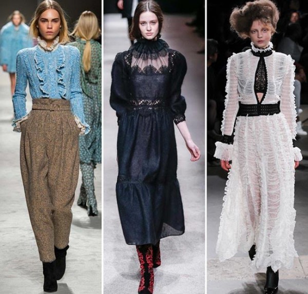 Мой персональный фаворит! Два необыкновенно женственных стиля, идущие друг за другом. Сложные крой, высокие кружевные воротники, затянутые талии, удлиненные формы, блузы с рюшами, корсеты, приталенные юбки, жабо, броши, банты, длина миди, прозрачное кружево — эти женственные элементы позволят каждой из нас почувствовать себя принцессой и мысленно перенестись в другую эпоху.