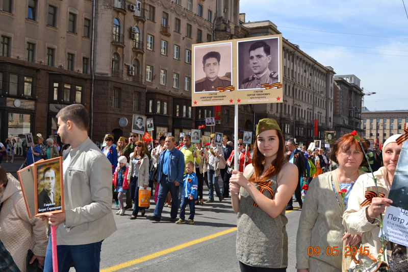 — Чувствовался праздничный порыв и единение. Потом в нашей группе во «ВКонтакте» были отзывы, что это неправильно — петь песни во время шествия, что чтить память нужно тихо, молча. Здесь я не соглашусь, ведь это праздник Победы. Я всё время вспоминаю кадры кинохроник, когда приезжали поезда с военными, и там неважно, свой — не свой, все обнимались и целовались, потому что это Победа, она принесена этими людьми. Для меня это большой праздник, он должен быть с песнями и криками «ура!».