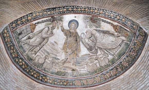 Христос вручает Закон ап. Петру и Павлу Мозаика мавзолея Санта Констанца. Конец IV в. Рим.