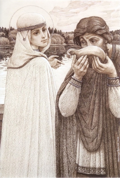Так или иначе, супруги оставляют Муром, уплывают из него на любезно предоставленных боярами судах. В ходе плавания происходит еще один эпизод, вызывающий множество споров и разногласий: праведная Феврония угадывает направленные на нее блудные мысли одного из сопровождающих, чья жена при этом находится с ними же. Княгиня предлагает мужчине зачерпнуть воды сначала с одной стороны от лодки, потом с другой, а затем сравнить, отличается ли вкус. «Так и естество женское одинаково. Почему же ты, позабыв про свою жену, о чужой помышляешь?» И здесь снова можно задать вопрос, почему речь идет не о любви и ее исключительности, а напротив, об одинаковости женского естества?