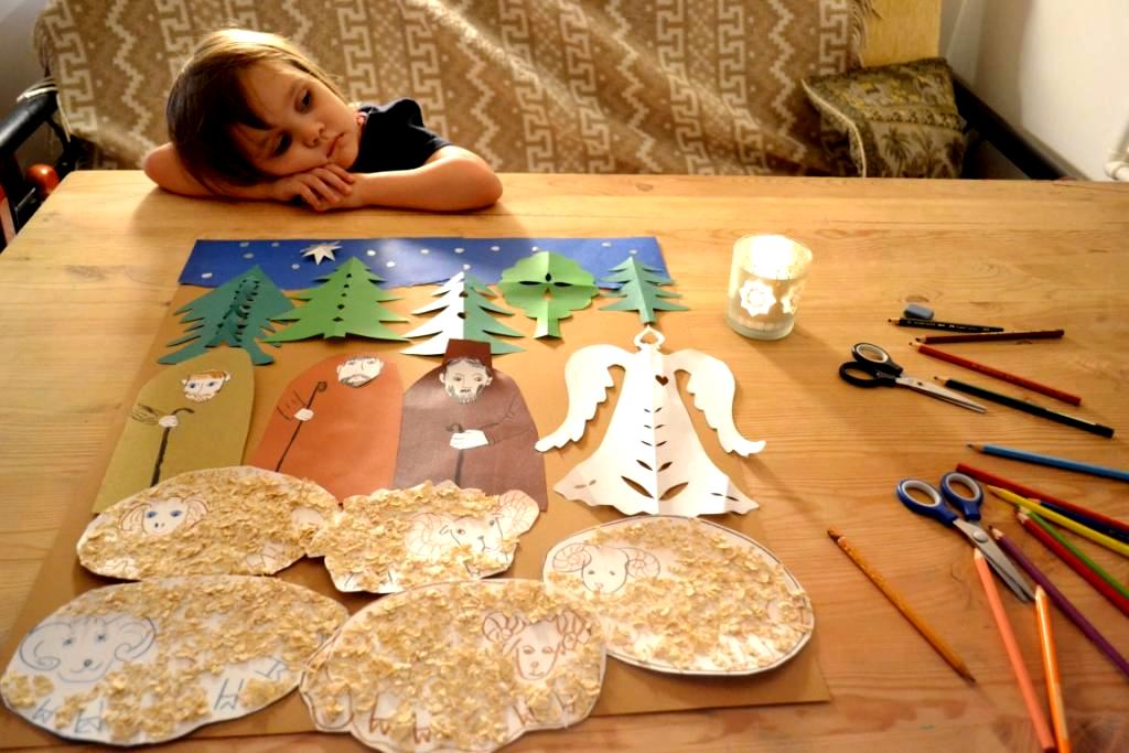Каждый пастух состоит из трёх частей: тела, головы и руки, держащей посох. Тело вырезаем из тёмного листа А4. Мы взяли три коричневых оттенка. Форма тела пастуха напоминает матрёшку, по принципу матрёшки изображается и голова: рисуем лицо на белой бумаге, вырезаем и наклеиваем портрет в верхней части тела. Карандашами рисуем рукав и посох, к посоху приклеиваем вырезанную из белой бумаги руку, выглядывающую из рукава. Ангела мы тоже вырезали из листа А4 белой бумаги, сложенной вдоль. Рисовать его просто: голова – половинка круга, одеяние – трапеция, и крыло. При желании можно обогатить изображение деталями.