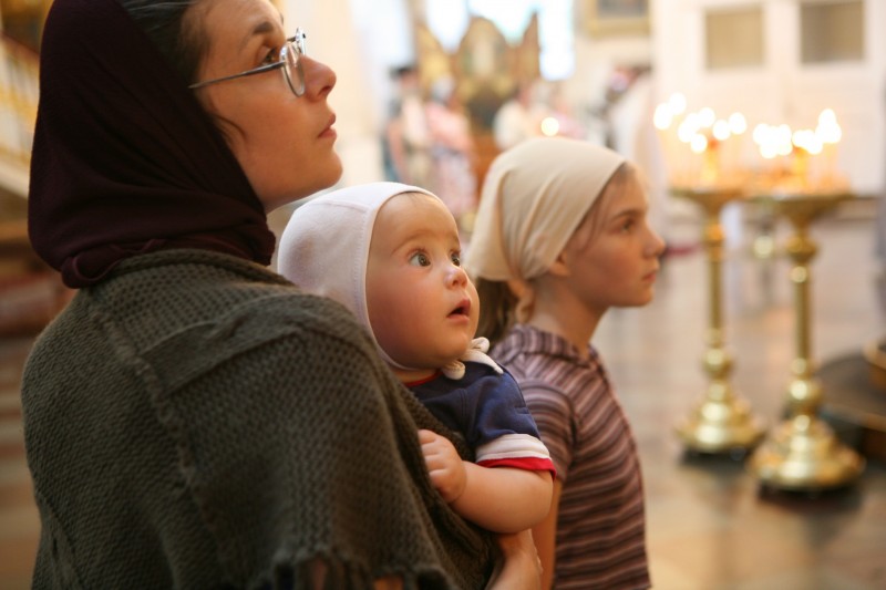 Словосочетание «дети в храме» вызывает у одних в голове умилительные картинки про детей почти с ангельскими крылышками, у других досаду при воспоминании о криках милых «ангелочков» самые неподходящие моменты службы. Родителям «ангелочков» тоже не всегда просто бывает… — Тамара, представляешь, мое чадушко сегодня потребовал гулять сразу же после возгласа: «Да никто от оглашенных…»! Не доросли мы, видно, до верных. Вернулись потом, конечно, но так забавно вышло! — Это еще что, нас сегодня с близняшками вовсе дома забыли! Подозреваю, что от того, что наш папа не хотел слушать всю службу концерт на тему: «А теперь я хочу другие колготки!». Так и сбежал со старшими, не разбудив нас с девочками. Этот смешной диалог с подругой, мне кажется, очень ярко иллюстрирует жизнь родителей. Дети в храме остаются точно такими же детьми, как и в других местах. Им точно так же хочется — бегать, играть, новых колготок, гулять. Таковы особенности детской психики — не может ребенок два часа быть сосредоточенным на чем-то одном! Вот и начинаются все эти концерты… Мешают ли концерты? Интересный, конечно, вопрос. Часто на любые попытки начать разговор о поведении детей в любом месте, в том числе и в храме, слышен ответ: «Это же ребенок!». Этой фразой обычно заканчивают повествования о том, как дети шумно играли друг с другом во время службы в догонялки, как мама не могла минут 15 успокоить ребенка, но почему-то не вышла, даже если выйти было можно… Мне всё-таки кажется, что это доведение до абсурда того неоспоримого факта, что дети от нас отличаются. Это такая своеобразная форма защиты. Родителям кажется, что все бездетные просто против детей. Специально уточнила у бездетной сестры, от которой иногда слышала жалобы на то, что дети на службах мешают, всегда ли так происходит. Она привела целый список ситуаций, в которых дети никак не мешают — когда как-то занимаются свечками, когда спокойно ходят по храму, рисуют, что-то говорят на своем языке. Даже лежащие на полу дети ее не отвлекают! Зато такие дети, особенно девочки в нарядных платьях, очень отвлекают их мам, — подумала я, вспомнив уже рассказ своей кумы про то, как ее дочка в белом платье на Пасху полежала где-то на полу и, разумеется, платье перепачкала. Концерты, конечно, мешают — и окружающим, и родителям. Всем сложно сосредоточиться на службе, отсюда и нервные мамы, и напряженные прихожане. Хуже того, сами дети устают. Ведь не закатывают дети концертов просто так. Конечно, это по большей части от усталости. Может, и не надо? Самым простым выходом из этой ситуации кажется, конечно, самый распространённый — приходить с детками только к Причастию. Это, вроде бы, и удобно: и ребенок не устает, и мамины нервы остаются целыми, да и окружающие только умиляются. Но тут сразу возникает несколько проблем. Первая в том, что в такой ситуации и сами родители оказываются в храме только к Причастию. А для взрослого человека всё-таки несколько странно приходить годами только к концу литургии. Вторая в том, что дети постарше начинают воспринимать походы на службу как что-то механическое. Пришли — подошли к Чаше — ушли. Странный ритуал, смысла которого и не видно. Попробуем разобраться, как можно совместить детей и службу с минимальными потерями для всех участников. Совсем маленькие С совсем маленькими, как ни странно, проще всего! Это