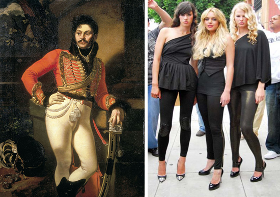 Сильно обтягивающие штаны, что-то среднее между брюками и колготками.  Завоевали популярность не так давно, но прочно. Если придерживаться истории, то леггинсы (от английского слова leg – нога) – это женская разновидность лосин. Лосины (первые лосины мастерили из кожи лося, именно поэтому их стали так называть) были парадными мужскими кожаными брюками, они надевались в смоченном виде из-за того, что были очень узкими. Высыхали лосины прямо на теле. Позже их стали шить из замши. Носить лосины было неудобно, потому что они натирали кожу ног. В России с 18 века лосины стали частью военного обмундирования.