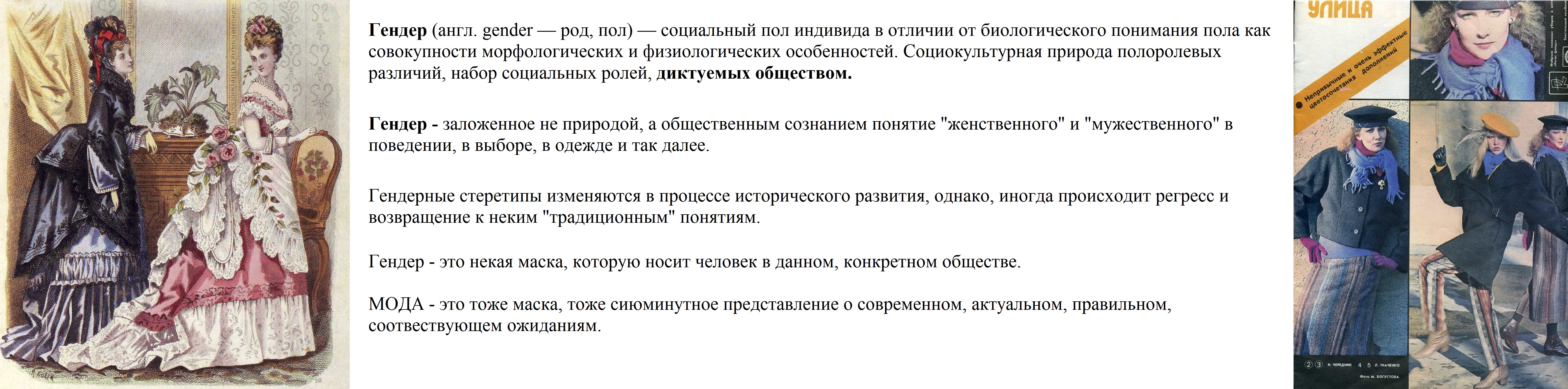 Гендер — это наш социальный пол. Не то, что  дается от рождения, а то, что нам навязывает общество, среда, власть, режим, религия — все, что нас окружает. На гендер также влияет социальный класс, к которому мы принадлежим. Два антипода: женщина XIX века, тонкий и ранимый цветок салонов, театральных лож и гостиных и женщина 80-х годов XX века — максимально независимая, угловатая, стремящаяся к мужскому поведению.