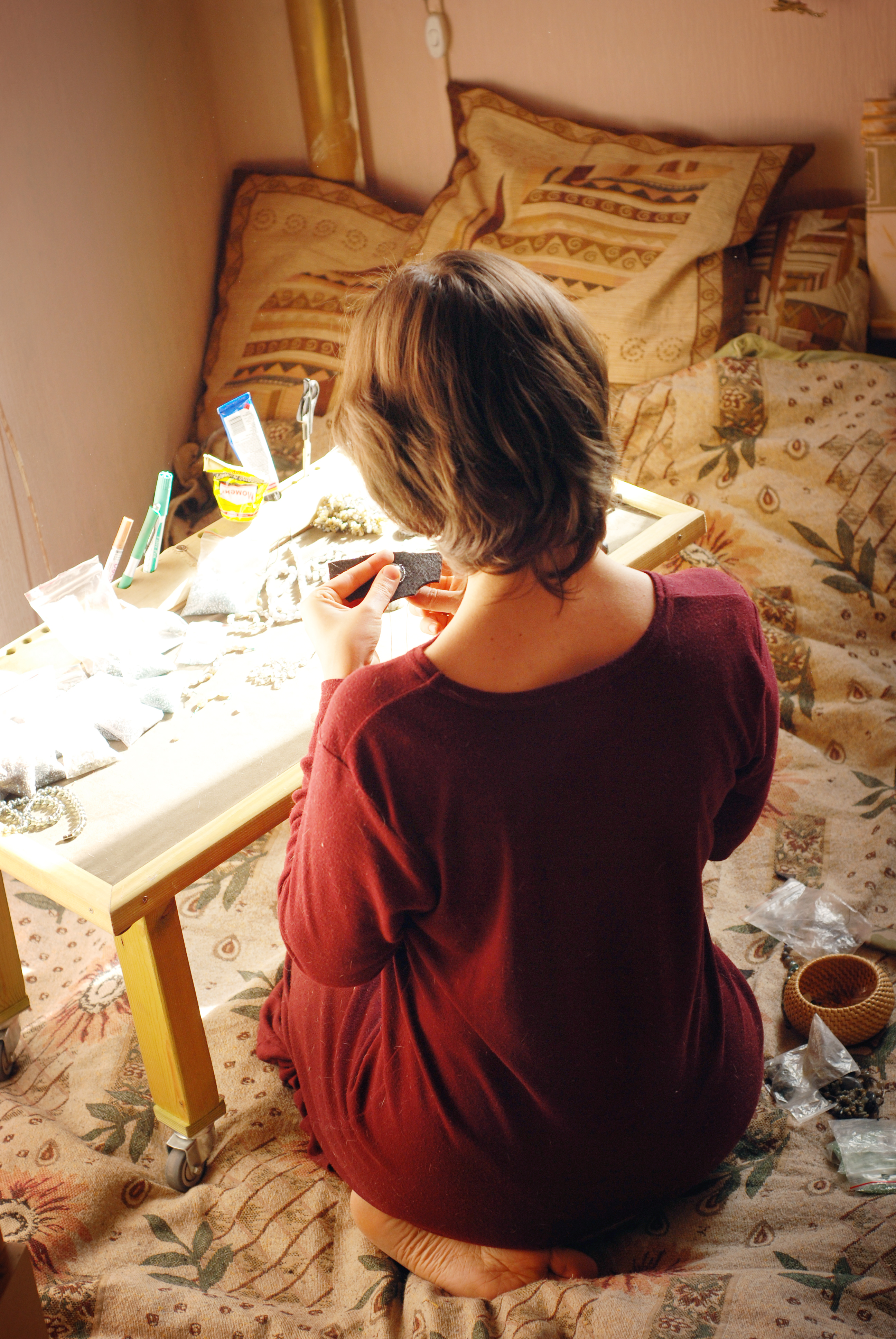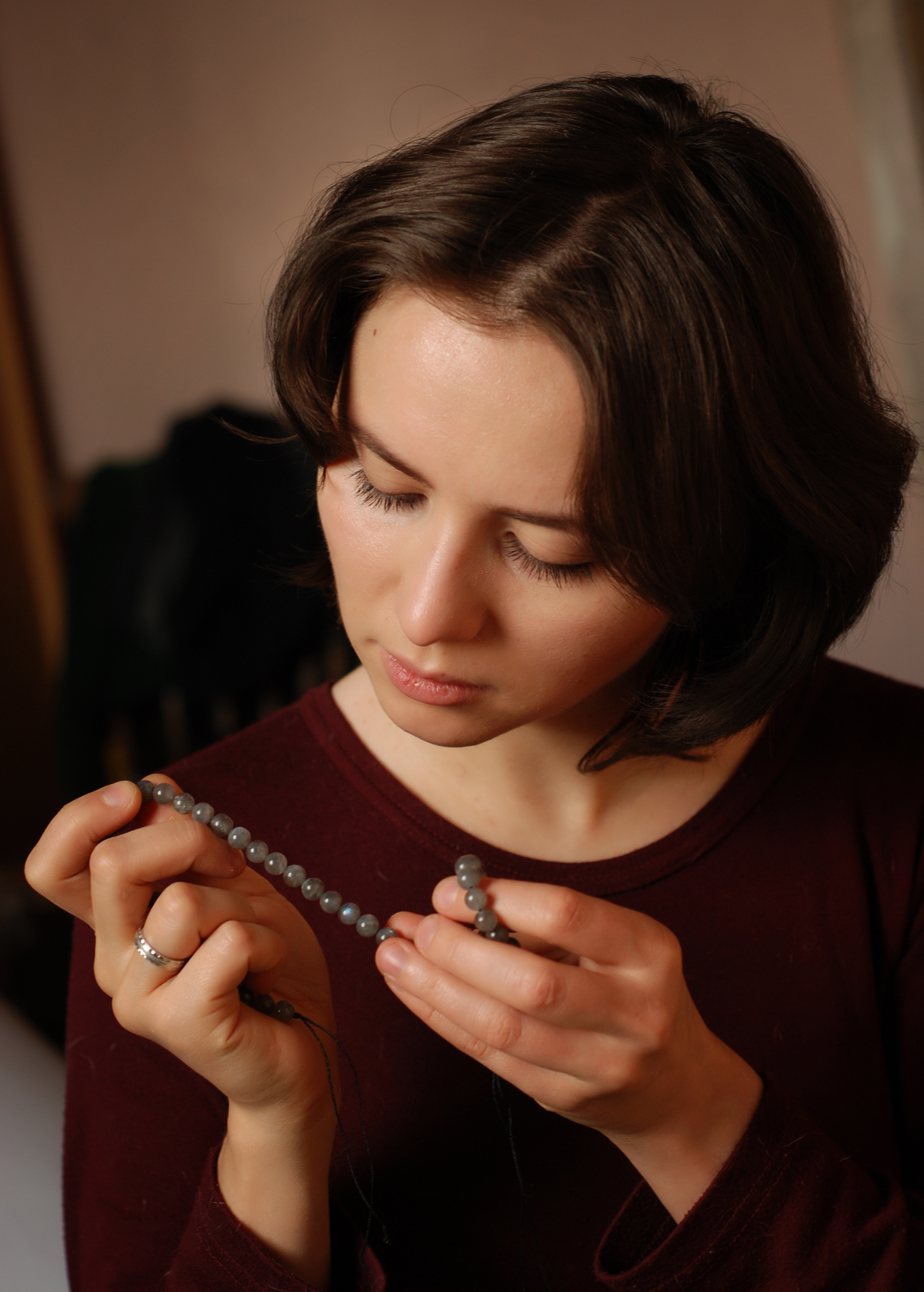 С Натальей Галецкой (сокращённо – Нэсли) я познакомилась почти десять лет назад. Я тогда знать не знала, что она в скором времени станет известна мне, да и многим в Рунете, как одна из самых потрясающих мастериц хенд-мейда, которых я когда-либо знала. Признаюсь честно, до знакомства с ее украшениями из бисера я весьма пренебрежительно относилась к этим стеклянным бусинкам, в чем сейчас раскаиваюсь. В тот день, когда я увидела ее впервые, стояла осень, прохладная, золотая, та самая, которая создает особое романтическое настроение. В этот день любители ролевых игр собрались в подмосковном лесу на праздник – лучный турнир. Я обратила внимание на девушку редкой красоты, которая стояла чуть поодаль от остальных. Уже много позже я выяснила, что ее зовут Нэсли, в миру Наталья Галецкая, но она почти не выходит в этот самый мир, так что и паспортным именем своим пользуется достаточно редко. Тогда же, в лесу, я просто отметила красоту незнакомой девушки и забыла об этой встрече. Несколько лет спустя я набрела на ее блог на просторах «Живого Журнала». Этот дневник содержал в себе настоящие сокровища — фотографии изумительных украшений из бисера, фурнитуры, полудрагоценных камней. Все было сделано «из мастерства, из ничего, из безрассудства моего». «Когда б вы знали, из какого сора» — друзья и знакомые охотно отдавали Нэсли порвавшиеся бусы, старые ключи, сережки без пары и прочий лом, а она создавала из них свои неповторимые рукотворные истории. Колье, серьги, браслеты, кольца, — все казались удивительно гармоничными, и каждое украшение было – как бы это точнее выразиться — живым. Да, именно живым — эти работы дышали, отражали характер их создательницы, ее настроение, рассказывали свою уникальную историю, вступали со зрителем в безмолвный диалог, не оставляя его потребителем, равнодушным созерцателем обычной искусной поделки. Глядя на эти работы, ты чувствовал себя сопричастным чему-то большему – не побоюсь этого слова, — искусству. А еще в своем блоге Нэсли рассказывала о своей жизни – живо, остроумно и увлекательно, как и положено лингвисту, хорошо владеющей русским языком. Она была вдумчивой и проницательной, чуткой, уважительной и внимательной к себе и к другим, как и положено человеку, чьим вторым высшим образованием стала психология. Мы познакомились поближе на просторах сети и стали общаться, с веселым изумлением обнаружив, что диаметрально противоположны почти во всем – от манеры общаться до способа проводить свободное время. Передо мной расстилались те самые просторы богатого внутреннего мира непохожего на меня человека, ведущего весьма интересную жизнь, по которым хотелось неспешно бродить, изучая. Рассматривая, как те «сокровища», что выходят из-под ее пропахших кофе пальцев. И тогда я решила сделать с Нэсли интервью. О ней самой и ее образе жизни, о том, что сподвигло ее уйти на фриланс из офиса. О ее домашних – муже, который по праздникам плюется огнем и способен сделать сюрприз в виде неожиданного ремонта кухни своими руками, двух собаках и гигантском слизне Диего (в бэкграунде у этой семьи еще и ворон с крысой). О том, что можно и даже нужно учитывать особенности своего характера и темперамента, чтобы построить жизнь не по принципу «как у всех», а по принципу «мне так удобно, и неважно, что скажут окружающие». О том, как на это во