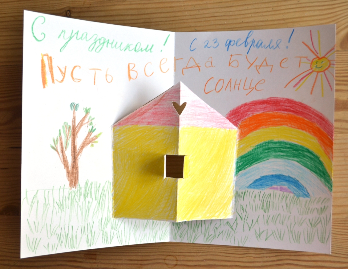 Как тело и душа человека соразмерны друг другу, так соотносятся земной край отцов и небесное отечество. Небесная родина, безусловно, главнее и выше, но пренебрегать земным отечеством – нашим временным домом – было бы несправедливо, поскольку оно тоже дано Богом. Словом, как нельзя менять местами главное и второстепенное, так не нужно умалять значение, которое имеет для нас родная земля. Именно за 23 февраля закрепилось празднование Дня защитника Отечества. Его установление связано с рядом достаточно бесславных страниц нашей истории. Но мы, как сказал поэт, истории не пишем, поэтому примем традицию за данность. И хорошо, что День защитника Отечества празднуют все: военные и гражданские, мужчины, прошедшие военную подготовку, а также те, кто не познал вкуса армейской каши. Ведь любое напоминание о мужской отваге и ответственности за порядок на вверенном участке родной земли не бывает лишним и в мирные времена. Каждую неделю мы встречаем в новостях свидетельства о героических поступках совершенно обычных людей. Кто-то во время ДТП прикрыл своей машиной автобус с детьми, кто-то отговорил человека прыгать с моста и тем самым предотвратил самоубийство, а кто-то просто шёл по улице и подхватил на руки выпавшего из окна младенца – и такое бывает! Такие поступки совершаются под влиянием порыва только на первый взгляд. На самом деле внутренняя готовность защитить человека, попавшего в беду, воспитывается постепенно, и не последнюю роль играет в этом любовь к родине. Сразу охватить умом, что же собой представляет наше отечество, трудно. Наглядно это понятие можно представить себе в виде расходящихся из одной точки кругов. Их общий центр – это личность отца, ведь не зря слово «отечество» со словом «отец» в русском языке имеет прямую смысловую связь. Так что начнем наши поделки с портрета дорогого и любимого папы. Пусть ребёнок сначала нарисует его на листе А4, а потом вырежет получившуюся картинку ножницами с фигурным краем. Затем поможем юному художнику разместить и приклеить получившийся овал (ну или почти овал) на лист цветного картона. Сделаем праздничные надписи, и поздравительная открытка готова! Подобную работу можно посвятить и дедушке, и старшему брату, и любому другому мужчине, значимому в жизни ребёнка. Следующая ступень познания отечества – это родной дом – частное владение или подъезд многоэтажного здания. В любом случае место, где проходит наше детство, не может не вызывать щемящего чувства, особенно если что-то в нём меняется. Рубят ли старые деревья во дворе или меняется планировка внутри родных стен – всё это больно отзывается где-то внутри, как будто рушится что-то такое, что должно оставаться незыблемым во что бы то ни стало. Сделать открытку в виде домика с двускатной крышей не составит вам никакого труда. Для этого сложим пополам альбомный лист, сделаем два надреза от линии сгиба и отогнём получившуюся фигуру. Затем изображение домика, также с помощью ножниц, оснастим окошком. В завершение дорисуем все необходимые детали цветными карандашами, мелками или фломастерами и сделаем поздравительную надпись. Трудно любить то, о чём нам известно мало. Поэтому следующим этапом нашего разговора об отечестве будет знакомство с родным городом. Чем славен ваш родной город? А с чем связан выбор именно тех элементов, из которых с
