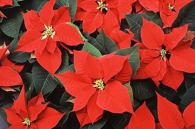 Еще одним символом Рождества из мира флоры стала пуансеттия, она же молочай красивейший. Особенность этого растения в том, что оно зацветает зимой, словно нарочно подгадывает к Рождеству. В период цветения верхние листья у него окрашены в интенсивный красный цвет, эти прицветники ошибочно принимают за цветок. Однако собственно цветки — мелкие и невзрачные, больше похожие на тычинки, но обладающие ярким желтым цветом. Эта гамма придает растению необыкновенную торжественную нарядность, его форма отдаленно напоминает вифлеемскую звезду. Прицветниками пуансеттии, чаще их имитацией из ткани и пластмассы, украшают рождественские венки.  Иногда горшочки с этим растением устанавливают на пирамидальную подставку, создавая красно-зеленую «елку». Мотивы пуансеттии и остролиста очень популярны в рождественских украшениях.