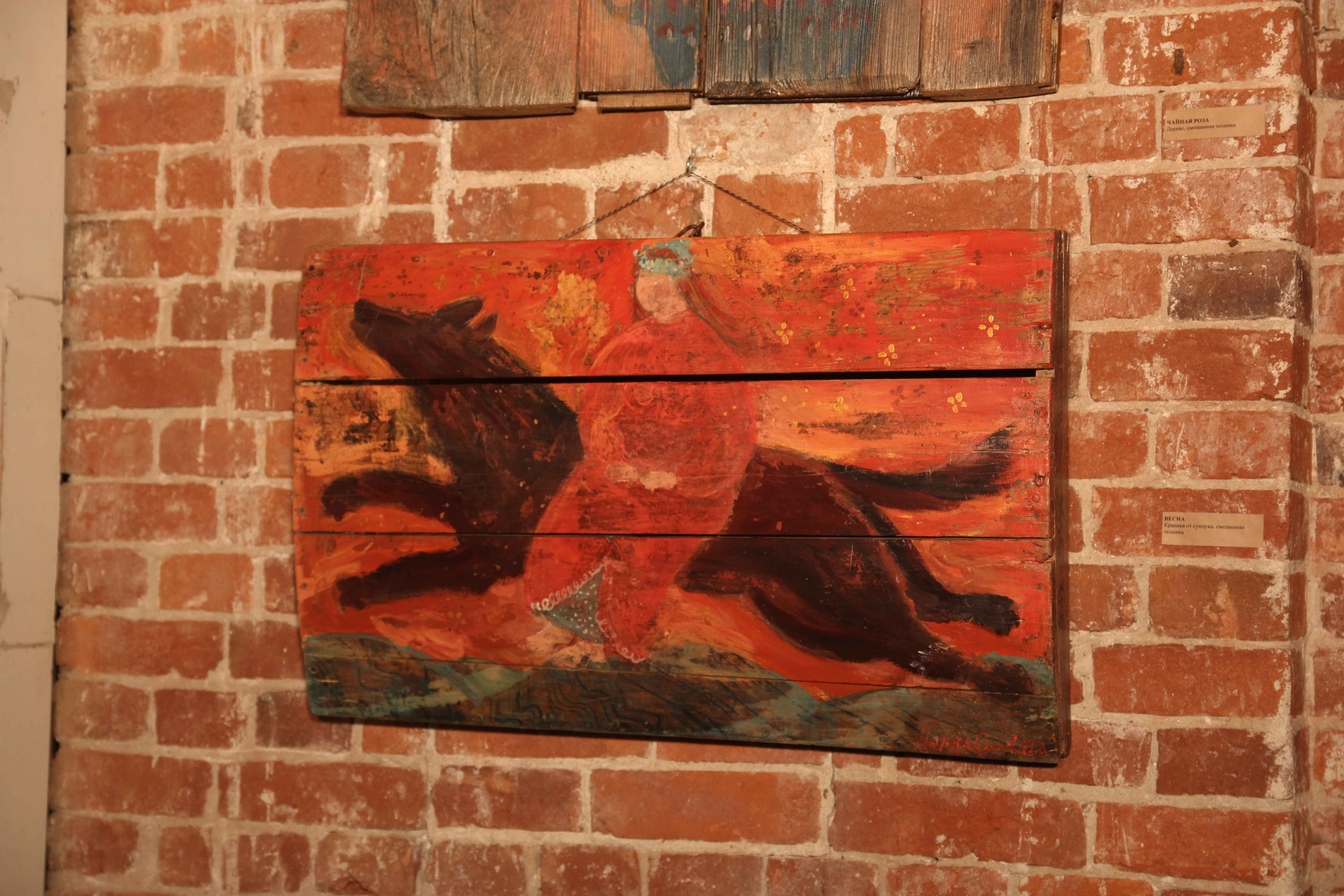 Она молода, но выставки ее картин в столице уже привлекают внимание. Ее сравнивают с Пиросмани, добавляя при этом, что в ее картинах больше добра и красок. Художница Маруся Соловьева создает удивительно теплые, душевные образы. Ее героями становятся простые люди или фантастические существа из народного эпоса, животные с добрыми глазами, ангельский и небесный мир, природа. Все они «оживают» на «деревянных картинах» художницы, ведь пишет она на старых потертых досках, фрагментах сундуков и дверей, найденных на улицах или в заброшенных домах. Дерево — удивительный материал. Оно впитывает в себя все, что вокруг него происходит, и долго хранит память об этом. Видимо, это свойство деревянной основы картин Маруси Соловьевой наделяет их особенным теплом. Она родилась в деревне Рождествено Тульской области и сейчас живет там практически отшельницей, вдали от суеты и шума больших городов. Мне удалось встретиться с деревенской жительницей Марусей Соловьевой на выставке ее картин в Москве и побеседовать с ней о ее жизни и творчестве. — Маруся, сразу напрашивается вопрос: вам не страшно одной в деревне? Не одиноко, не тоскливо? В особенности зимой, когда рано темнеет? — Нет, не страшно. Бывают, конечно, какие-то моменты, но не хочу жаловаться. Одиноко может быть и в городе, и когда ты живешь в семье. Важно внутреннее состояние, а то, что нас окружает, — это все-таки больше декорации. Страдать тоже полезно. Бывает, и счастье накатывает, и грусть, как, наверное, и у всех. Слушаю рассказы других людей и думаю: «Какая же я все-таки счастливая!» Если удается найти что-то интересное для творчества, я испытываю счастье. Счастливой меня делает и состояние влюбленности, в котором я нахожусь почти постоянно. Объект моих чувств при этом не имеет значения. Я могу любить и на расстоянии. Когда я никого не люблю, это не моя история. Пока я не замужем, но хочу создать семью. Для меня это очень важная вещь. Мне кажется, я почувствую, когда придет это время. Стараюсь прислушиваться к своему сердцу. Думаю, что не стоит гнаться за счастьем, оно придет само, когда человек будет готов его принять. Я примерно знаю, какой мне нужен человек. Ориентируясь на свой жизненный опыт, я сделала выводы, но говорить об этом не хочу, чтобы не спугнуть свою удачу. А что касается темноты, то вообще я ночной человек. Днем я занимаюсь обычными делами, хозяйством, готовлю и очень люблю это делать, а ночью пишу где-то часов до четырех утра. Конечно, это не очень хорошо, но почему-то мозг у меня активируется именно ночью. На участке я ничего не сажаю, у нас северная сторона, ничего толком не растет. Гуляю по лесу, летом гуляю с собакой, катаюсь на велосипеде, отправляюсь в походы за старыми досками для картин. Практически я всегда одна. У меня есть пара друзей, которые мне помогают, но все равно это такая философская тема — где лучше, в городе или в деревне? Вот все стремятся в Москву, а мне это пока просто не нужно. Жить в Москве, снимать квартиру — не моя реальность. А в деревне все естественное, настоящее. Иногда выбираюсь в кино, на мероприятия, но по большому счету мне незачем жить в городе, особенно в таком огромном, как Москва. Я человек природы и стараюсь не противоречить себе. Мне плохо без леса. Но не могу сказать, что проживу так всю жизнь. Все-таки людей, социума мне не хватает. — Наверное, для творчест