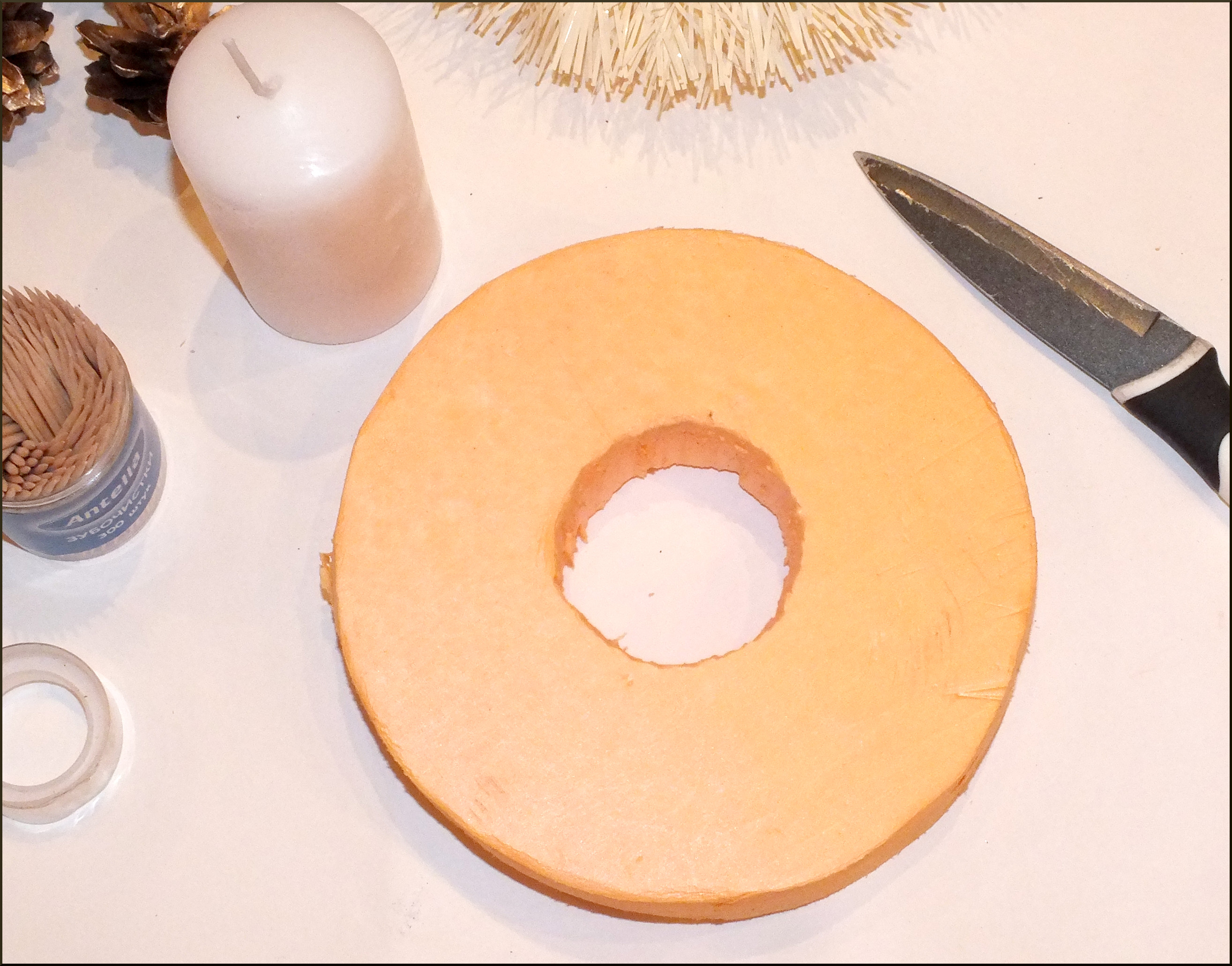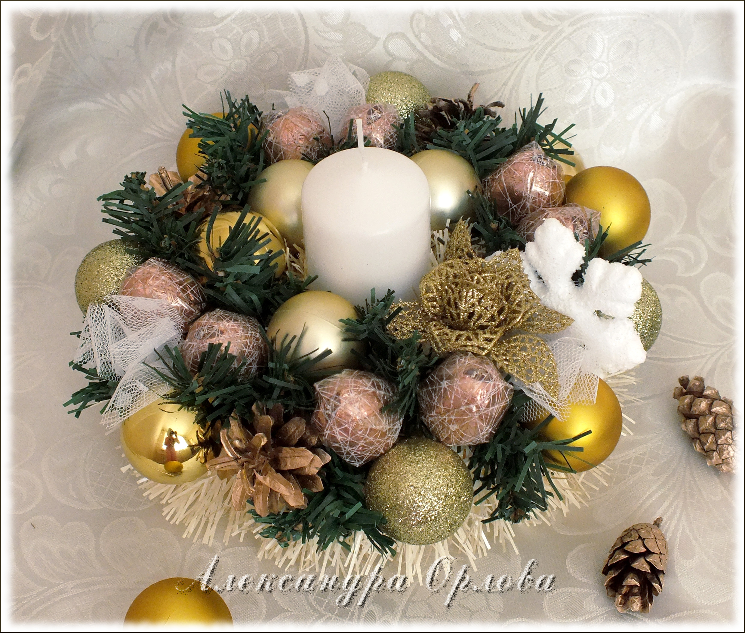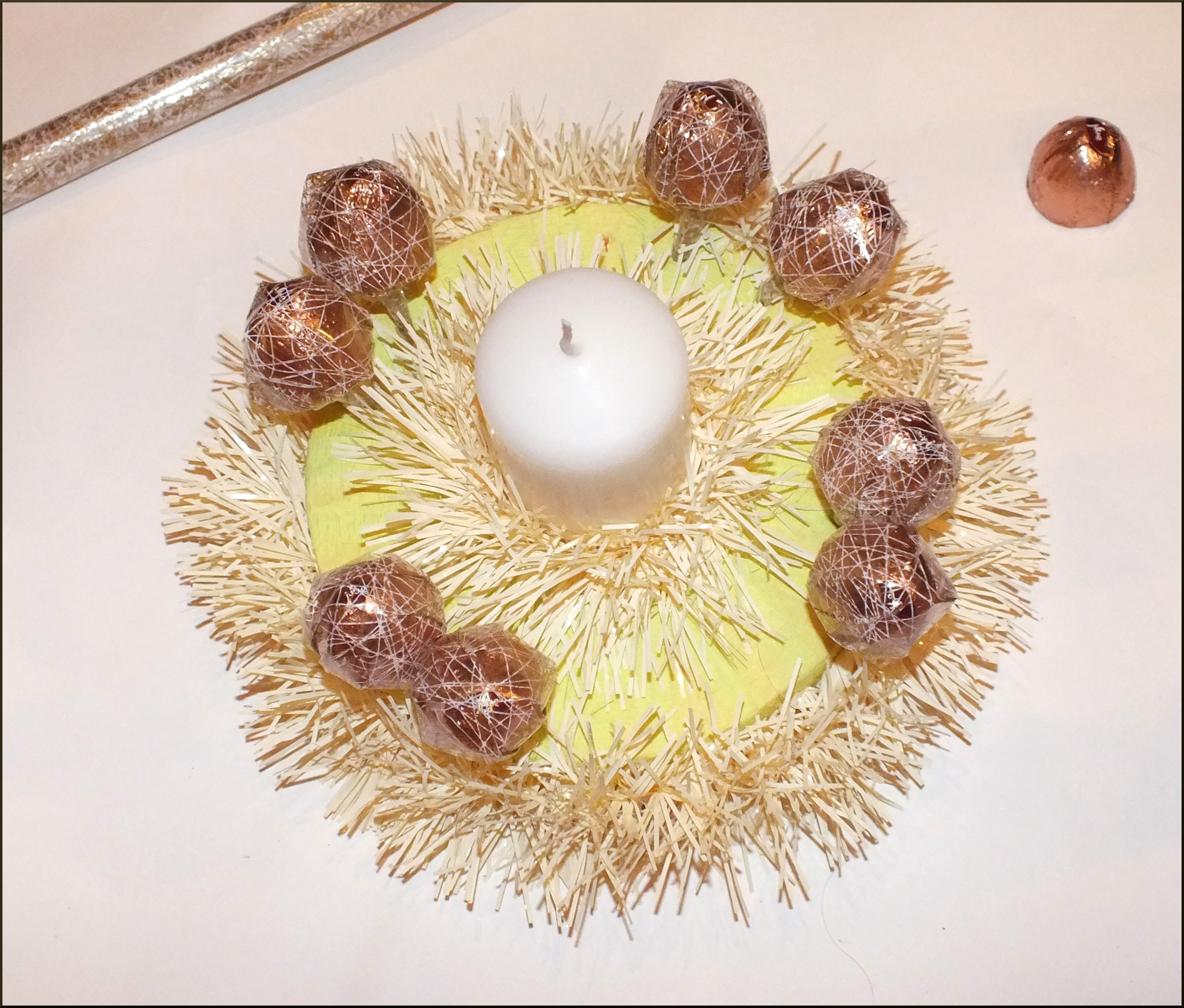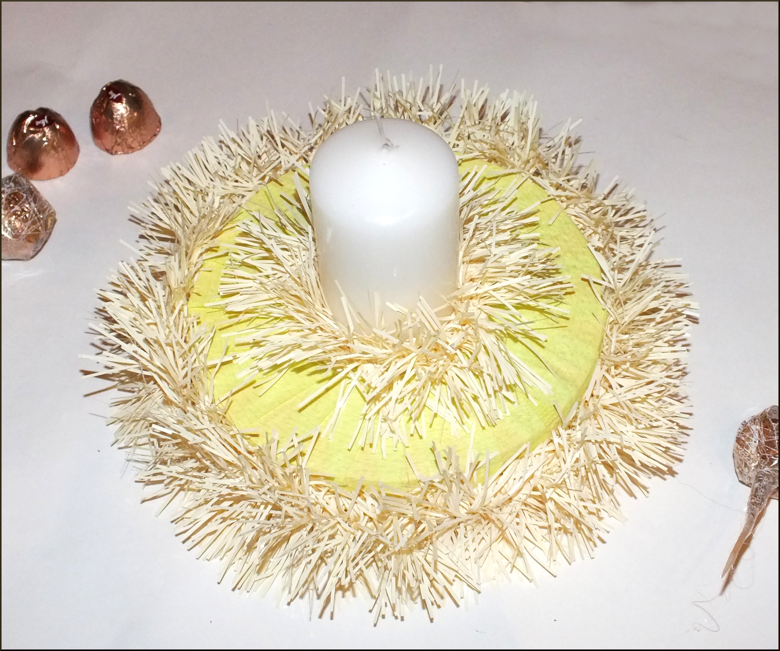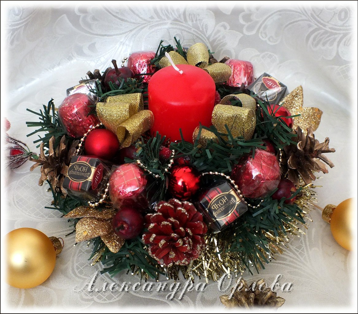 Приближаются зимние праздники. Посмотрите на календарь: ещё две среды, и вот уже Новый Год! Для тех, кто хочет создать необычную уютную атмосферу в доме, погрузиться в предпраздничные хлопоты и «натворить» чего-нибудь этакое, я расскажу, как своими руками сделать оригинальную композицию, которая послужит отличным подарком для сладкоежек или украсит ваш праздничный стол. Вы можете сделать эту нарядную поделку уже сегодня или запланировать вечер творчества с детьми на длинных выходных. Выбор за вами! Вам понадобятся: -пенополистирол/пенопласт; -свеча; -карандаш/ручка; -картон; -острый нож; -гофрированная флористическая бумага/бумага для детского творчества; -конфеты (несколько штук); -зубочистки/шпажки; -прозрачная пленка; -горячий клеевой пистолет/клей; — скотч; -мишура; -декоративный материал (шарики,елочные украшения,шишки,ленты,бусины и т.д.); — и пара часов времени. На кусок пенопласта (я использую пенополистирол, т.к. пенопласт сильно крошится, но зато значительно лучше режется!) положить небольшое блюдечко, обвести карандашом, и вырезать острым ножом. В середину полученного колечка примериваем свечу, обводим, также вырезаем: получается нечто вроде «бублика». Далее из плотного картона вырезаем круг, соответствующий по диаметру нашему будущему подсвечнику и оборачиваем его гофрированной флористической бумагой (вырезаем круг с припусками, как это показано на рисунке, припуски приклеиваем). Для этих целей можно использовать бумагу для детского творчества, продающуюся в рулонах в канцелярских магазинах. Для удобства я использую клеевой пистолет, мгновенно фиксирующий все материалы и детали, но можно использовать и другой клей, например «Момент кристалл», главное — проявить аккуратность при склеивании. Из гофрированной бумаги вырезаем полоску 3-4 см.шириной и также оборачиваем ею «бублик». Склеиваем детали. Серединку и края обклеиваем мишурой. Форма для подсвечника готова! Вставляем свечу. Вырезаем из прозрачной пленки квадраты, берем шоколадные конфеты (лучше всего в подсвечниках смотрятся кругленькие шарообразные или куполообразные конфетки, в ярких — золотых,красных,зеленых,синих обертках), оборачиваем пленкой и приклеиваем к зубочистке, используя узкий скотч. Вот что получается в итоге. Изготавливаем таким образом необходимое количество конфеток (от 6-ти до 10 обычно бывает достаточно). Втыкаем зубочистки с конфетками в подсвечник. Примерно так: Далее на клей крепим зубочистки/шпажки к декоративным элементам: новогодним шарикам, лентам, шишкам и т.д., для того чтоб воткнуть их в подсвечник. Здесь наступает самый увлекательный украшательства: можно дать полную волю фантазии:). Наш подарок готов! Теперь его можно упаковать, завязать роскошный бант и преподносить счастливому обладателю! Варианты оформления подсвечников: Счастливого Нового Года и веселого Рождества!
