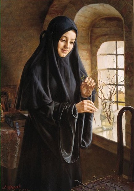 В памяти сразу возникает образ красивых одухотворенных людей с высокими клобуками и развевающимися черными мантиями, проносящихся по Псково-Печерскому монастырю… Старцы, богословы, молитвенники… А что такое женское монашество? Многие уверены в том, что главное призвание женщины – это материнство… Если так, рассуждаем мы с трудницей, то что может его заменить? Неужели бесконечные хозяйственные работы в восстанавливающихся монастырях? Тяжелый труд на монастырской кухне? Или, может быть, послушание гида по обители?
