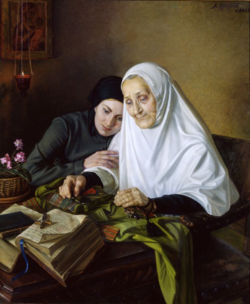 А. Шилов. За Веру и Отечество. Разведчица Великой Отечественной войны Н.В. Малышева, монахиня Адриана, насельница Пюхтинского подворья, 2008 г.