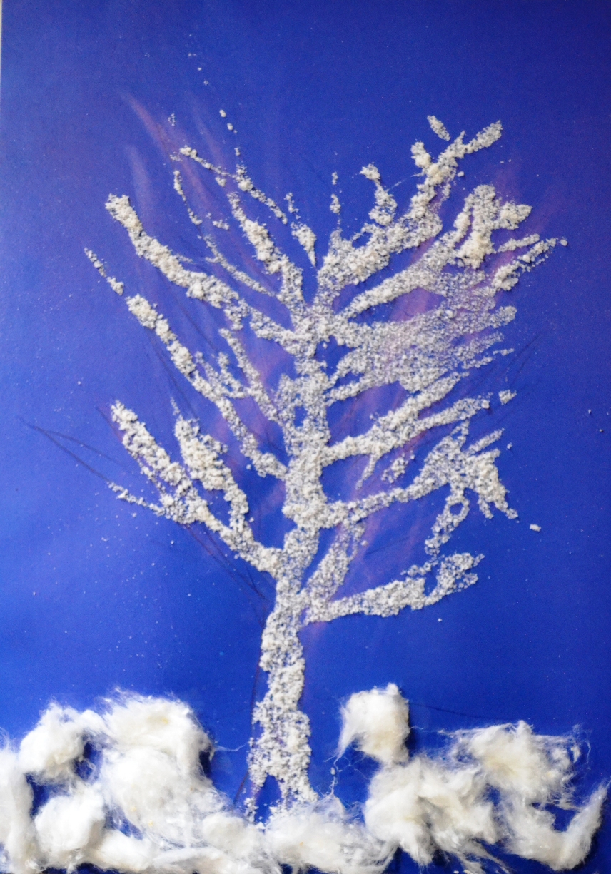 Изобразим заснеженное дерево из зимнего леса — места, где история Звёздного Мальчика только начиналась. Покрытые снегом ветки деревьев, белая земля, яркое небо. Для основы возьмём лист картона синего цвета. Покрытые инеем ветки нарисуем клеем ПВА, пользуясь кончиком флакона как карандашом. (Маленьким детям нужно объяснить, что клей держать следует аккуратно, не сильно сжимая его пальцами.) Дальше можно воспользоваться либо манкой, либо солью. Стряхнув лишнее, мы обнаружим на картоне изображение дерева, покрытого снегом. Снежный покров на земле тоже можно сделать двумя способами: из кусочков бумажной салфетки или из ваты.