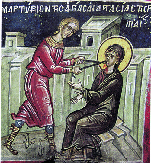 Когда в детстве ты читаешь жития святых мучеников, то в большинстве своем они воспринимаются как сказочная история с непременным счастливым окончанием, то есть Царствием Небесным. Редко кого в ту пору волнуют до замирания сердца сами мучения, которые приходится претерпеть страдальцам, они словно являются просто непременным атрибутом интересной истории. Став старше, ты читаешь жития совсем иначе, совершенно по-другому пропуская их через себя. Если детская жажда героизма чаще всего сопряжена с обязательным «Вот бы мне так!» (крамола, но – неважно, что ты читаешь, житие святых или повесть о пионере-герое), то повзрослевшее сознание сначала задается осторожным вопросом: «А смог бы я – так?»… *** Годы жизни и даже смерти преподобномученицы Анастасии Римляныни точно неизвестны. Эту святую, называемую Старшей, нередко путают с Анастасией Узорешительницей, получившей прозвание Младшей (уж не говоря об Анастасии Римской), но все же можно четко выстроить ее житийную историю и определить, как минимум, приблизительное время и место земной жизни: окрестности Рима, II век. Святая Анастасия в трехлетнем возрасте осталась сиротой и воспитывалась игуменьей одного из монастырей, находившихся рядом с Римом. Старицу-настоятельницу звали Софией, она вырастила девочку как родную дочь, полюбив ее всем сердцем. Анастасия выросла удивительной красавицей, и многие знатные римские юноши и мужчины предлагали ей руку и сердце, но девушка, воспитанная в строгих монастырских правилах, не видела для себя другого жениха, кроме Жениха Небесного. Когда девице исполнилось двадцать лет, слава о ее красоте уже достигла ушей всех римлян, однако далеко не все склонны были просто восхищаться ею. Нашлись те, кто составил на Анастасию несколько доносов владетельному военачальнику по имени Пров. Не забыв упомянуть о прекрасной внешности девушки, доносчики указывали на такую её вину, как исповедание христианской веры. Поскольку в те времена мирное время жизни часто сменялось гонениями на христиан, в этом нет ничего удивительного. Так случилось и на сей раз: Пров велел привести к нему девицу, чтобы, во-первых, воочию убедиться в том, так ли она красива, как говорит о ней молва, а во-вторых — разобраться с ее верой. Посланники военачальника сначала долго не могли попасть в монастырь – тяжелые двери просто-напросто отказывались открываться перед ними, так что мужчинам пришлось пустить в ход топоры. Этим они страшно напугали насельниц обители, которые, быстро собравшись, убежали через вторые ворота. В опустевшем монастыре остались только двое: София и Анастасия. Игуменья позвала к себе девушку и сказала, что пришло время ее страданий за Того, Кого она выбрала своим Небесным Женихом. Старица успокаивала свою воспитанницу и убеждала ее с честью и верой вынести все испытания, которым может подвергнуть ее ополчившийся военачальник, ведь все они окажутся ничем по сравнению с той наградой, которая будет ждать ее на небесах. Когда посланники Прова наконец ворвались в монастырь, они обратились к Софии с просьбой отдать им девицу. — С радостью, — ответила игуменья, — но прошу вас, дайте мне два часа, чтобы я могла должным образом подготовить свою воспитанницу. Естественно, воины подумали, что Анастасию будут наряжать в красивые одежды, заплетать ей волосы и надевать разные украш