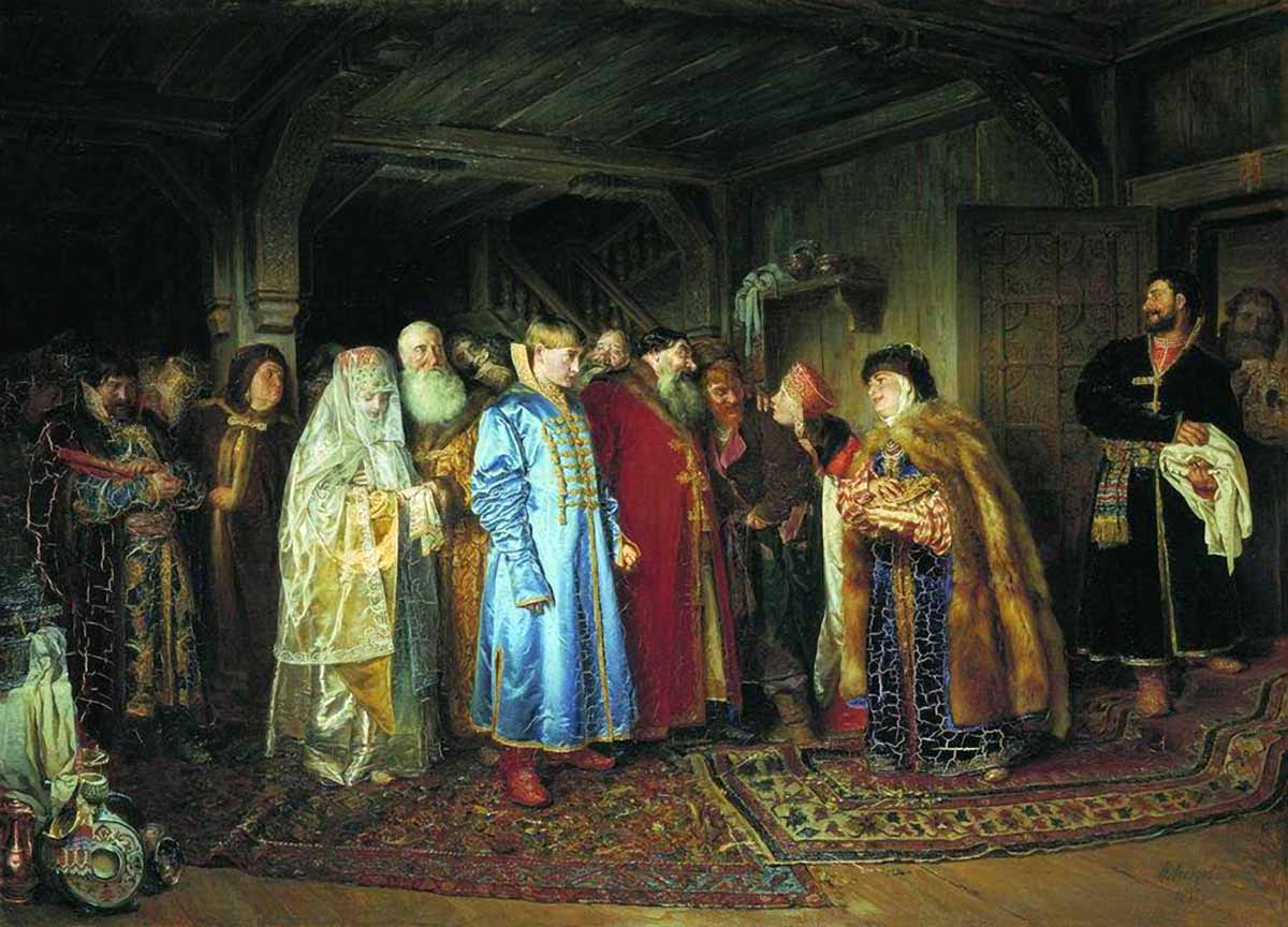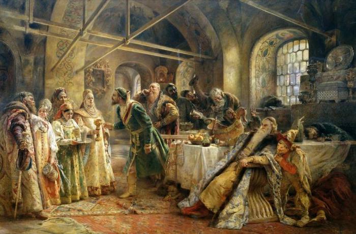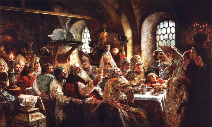 Как часто, читая о людях прошедших эпох, мы от всей души выносим им приговор «странные»: «Вот странные были люди, придумывали себе сложности в жизни, как будто им не хватало». А того не приходит в нашу голову, что люди были просто другие, по-другому воспринимали мир. В своё время меня чрезвычайно позабавила книжка Леонида Юзефовича «Как в посольских обычаях ведётся» про древнерусский посольский церемониал. Вообразите себе: в старину на Руси было представление, заимствованное, вероятно, откуда-то с Востока, о том, что путь посольства надо измерять не пройденным расстоянием, а днями. И, чем дольше идёт в страну посольство, тем, больший оно, выходит, проделало путь и, следовательно, тем большее почтение оказало государю, к которому было послано. Удивительно ли после этого, что, попав на просторы Руси, иностранные делегации там просто терялись, под руководством местных проводников добросовестно петляя по буеракам. Сохранились даже воспоминания каких-то особо несчастных голландцев XVII века, которые, несмотря на все усилия русских сусаниных, добрались до Москвы на целый месяц раньше расчётного срока, и тут выяснилось, что дом, где их планировали поселить, чтобы ещё немножко подержать за городом, не достроен, печка там чадит. В итоге невезучие послы спали чуть не на полу вповалку, в качестве особой милости выпросили себе разрешение пройти в город инкогнито, чтобы посмотреть на чин освящения Иордани (дело было в январе). И лишь где-то после Татьянина дня посольство, наконец, вошло в город официально. Поцелуйный Обряд (Пир У Боярина Морозова). К. Е. Маковский, 1895 г. Да что там, предметом споров становились подчас такие «жизненно важные» детали, как «кто первый спешился – предводитель иностранного кортежа или глава русской приветственной группы, что была выслана встречать его к воротам города». С почти героическим восхвалением (не с русской стороны, разумеется) сограждане вспоминали руководителя одной из делегаций, который остроумно додумался, почти коснувшись ногой земли, извернуться в стремени и впрыгнуть обратно в седло, посрамив тем самым русских, которые, так вышло, аж несколько секунд стояли перед ним, конным, пешие. А количество балясин в ограде царского дворца, которые посольству дозволялось, опять-таки проехать конным! Вы, поди, и не задумывались, как это важно, а в древности из-за этого поднимались целые дипломатические баталии. Наиболее почётным гостям разрешали доехать верхом практически до входа, менее уважаемые – топали пешком от самого края крыльца. И ведь не шутки – оказавший почтение посольству, демонстрировал тем самым уважение к пославшему его государю. А уж какие страсти кипели вокруг царских подарков и статуса посольств! Количество и стоимость подношений также воспринимались как овеществлённое уважение к государю, и поэтому подарки всегда вносились в город специальным шествием, на которое как на редкостное развлечение сбегались посмотреть местные жители. Доходило до казусов – когда кто-то из английских монархов, стеснённый на определённый период в средствах, вынужден был презентовать русскому царю всего-то серебряный кувшин, последовало особое предписание послу — обратить внимание получателя на изящество вещи и тонкость её отделки. А если отправленные живые подарки – например, охотничьи птицы, которыми русские 