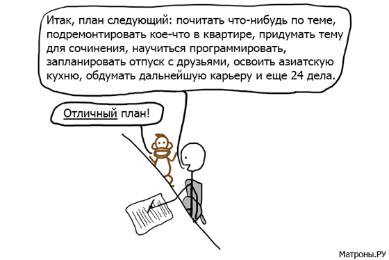 Читайте также: О прокрастинаторах, или Почему мы все откладываем на потом Текст о Великом Прокрастинаторе и его друзьях, Обезьянке сиюминутного удовольствия и Монстре паники, задел за живое многих участниц нашего клуба. Ответ на вопрос «Кто виноват?» наконец-то найден, и самое время переходить к следующему этапу, не откладывая его в долгий ящик. Портал Матроны.РУ предлагает перевод второй части статьи Тима Урбана и Эндрю Финна, ведущих блога Wait but why о борьбе с прокрастинацией. Сегодня мы узнаем о том, как же научиться делать необходимые дела вовремя. Ирония судьбы: в течение долгого времени я был сапожником без сапог, прокрастинируя в отчаянных попытках написать материал о прокрастинации и борьбе с ней. В течение последних двух недель я уподоблялся этому инструктору по стрельбе, который на занятии по безопасности обращения с оружием прострелил себе ногу. Я мечтаю поскорей закончить эту статью и вновь погрузиться в пучину упоительной и не замутненной никакими обязательствами неги. Прежде чем начать говорить о серьёзных вещах, давайте договоримся вот о чем: Я не профессиональный психолог, а всего лишь опытнейший прокрастинатор, который размышляет на эту тему все время. Я по-прежнему отчаянно сражаюсь со своими плохими привычками, но за последние несколько лет мне удалось добиться определенного прогресса, и я хочу рассказать о том, что помогло лично мне; В этой статье речь идет как о людях с легкой формой синдрома дефицита внимания, так и о тех, у кого это расстройство не диагностировано (при этом разница между этими двумя группами зачастую практически незаметна). Однако тем, у кого синдром дефицита внимания запущен сильно, может потребоваться другая помощь, отличающаяся от того, что описано здесь; Я опоздал со сдачей этого материала не только потому, что мне потребовалось 2000 лет на его написание, но и потому что в самый разгар работы мне резко приспичило открыть программу Google Earth, сфокусировать обзор на южной его части и затем медленно продвинуться на север, «чтобы лучше почувствовать Индию». Говорю же – у меня проблемы; Я постараюсь писать максимально серьезно, потому что при всех смешных сторонах прокрастинации она представляет собой серьезную проблему для многих людей, не давая им быть счастливыми. Итак, в прошлый раз мы подробно разобрали противоречия, которые раздирают среднестатистического прокрастинатора. Сегодня, когда нам предстоит что-то с этим сделать, нам придется копать еще глубже. Давайте вновь рассмотрим психологические аспекты прокрастинации и выявим основные из них: Мы уже знакомы с Обезьянкой сиюминутного удовольствия (так мы условно называем ту часть мозга, которая и заставляет нас прокрастинировать) и ее главенство над Человечком дела, принимающим рациональные решения, но каким именно образом она берет над ним верх? Прокрастинатор страдает от плохой привычки, граничащей с зависимостью, которая заключается в том, что обезьянке все время позволяют побеждать. Прокрастинатор мечтает взять эту обезьянку под контроль, но каждый раз пытается сделать это с помощью неработающих методов, уже сто раз доказавших свою неэффективность. Более того, в глубине души он знает, что обезьянка победит и на этот раз. Человек обещает себе измениться, но укоренившиеся привычки остаются неизменными. Почему же вполне дееспос