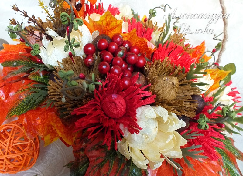 Все больше школ принимают участие в новой акции «Дети вместо цветов»: дети вместе с родителями и учителями принимают решение отказаться от покупки дорогих букетов, а сэкономленные деньги тратят на благотворительность. Конечно, не в нашей традиции совсем отказываться от знаков внимания учителю. Поэтому наш мастер-класс подойдёт для таких случаев. Кроме того, оригинальный букет из конфет можно сделать вместе с ребенком к 1 сентября или Дню учителя, а поделка, сделанная с душой, наверняка запомнится и учителю, и самому ребенку. Вам понадобятся: — флористическая проволока; — пенополистирол/пенопласт; — гофрированная флористическая бумага/бумага для детского творчества разнообразных осенних, теплых цветов; — конфеты «Марсианка», «Эклеры» или другие шарообразные или овалообразные небольшие конфетки (несколько штук); — нитки или скотч; — горячий клеевой пистолет/клей; — ножницы; — шпажки для шашлычков (можно несколько карандашей); — искусственные веточки клена, зелени; — флористический и декоративный материал (яблочки, гранаты, желуди, бусины, стразы и т. д. — все,что подскажет ваша фантазия) — упаковочный материал для цветов; — и несколько часов свободного времени. Изготавливаем заготовку для букета, для этого вырезаем из пенополистирола/пенопласта круглую форму, обклеиваем ее гофрой. Берем несколько палочек для шашлычков (можно использовать карандаши), так же обматываем ручку гофрой, вставляем в заготовку, приклеиваем горячим пистолетом. Как сделать хризантемы из конфет Флористическую проволоку (можно использовать зубочистки или те же шпажки для шашлычков) режем на 2 части, один конец загибаем в виде петельки для жесткости и прикручиваем к ней конфетку за «хвостик», для надежности скрепляя нитками или прозрачным скотчем. На фото показано, как держится конфета. Вырезаем вдоль ленту из гофрированной бумаги шириной примерно 3 см и длиной 10 см. Перекручиваем ее посередине, делаем пальцами углубление с двух сторон, чтоб в него поместить конфетку, закрепляем. Для иголочек хризантемы вырезаем 4 полоски (поперек гофрированной бумаги), примерно 11 см шириной и 5 см шириной, причем две полоски должны быть чуть поуже (для центра цветка), другие две — пошире. Делаем из полосок «лапшу»,как показано на фото. Чтоб «лапша» стала похожа на иголочки хризантем, придаем полосочкам заостренную форму пальцами. Гофра очень податливая, ее можно мять и гнуть, не боясь порвать. Оборачиваем цветок, закрепляем ниткой, и срезаем лишнюю бумагу у плодоножки. Оборачиваем плодоножку полоской (вырезанной поперек) из зеленой гофры, предварительно закрепив у головки клеем. Как сделать чайную розу Прикручиваем конфетку. Вырезаем из гофры (поперек) полоску длиной примерно 10 см, шириной примерно 4 см, а также вдоль гофры — полоску шириной примерно 4 см, длиной примерно 5 см. Из первой полоски вырезаем серединку для розы, растягиваем ее и помещаем внутрь конфету. Далее вырезаем лепестки, которым также придаем выпуклую форму и приклеиваем по спирали к цветку. Далее вырезаем зеленые лепестки для плодоножки, оборачиваем цветок и завершаем его изготовление подобно хризантеме. Изготавливаем нужное количество цветов. Далее оформляем нашу композицию: втыкаем в заготовку для букета розы и хризантемы, искусственную зелень, искусственные цветы, листья клена, разнообразн