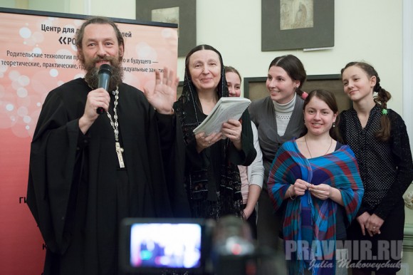 Читайте также: Ольга Юревич: книга о Боге, написанная на полу 19-20 ноября 2013 года в Москве состоялся III Всероссийский форум «Святость материнства» на тему «Семейные ценности в современном информационном пространстве», организованный Фондом Андрея Первозванного и Центром национальной славы. В форуме, собравшем более 400 участников из 60 регионов России, а также из Греции, Италии, Китая, США, Украины и Белоруссии, приняли участие и многодетные родители. Среди них настоятель храма Живоначальной Троицы при Черкасской богадельне в Москве протоиерей Андрей Юревич и матушка Ольга Юревич – выпускница Московского архитектурного института, автор книги «Матушкины цветочки». Мы познакомились с ними 16 ноября 2012 года на презентации книги Екатерины Бурмистровой «Беременность, роды, материнство». Помню их задушевное пение в конце вечера. «Дай руку мне!» – пел батюшка. «Возьми еще и сердце», – отвечала матушка. — Отец Андрей, матушка Ольга была у мамы одна, а у вас с ней семеро детей – шесть девочек и один мальчик. Четверых из них я видела год назад в культурном центре «Покровские ворота». — Да, это был замечательный вечер! Уверен, что книга «Беременность, роды, материнство» могла бы стать хорошим подарком для участников нынешнего форума. Хорошо бы издать ее в серии, посвященной возрождению счастливой многодетной семьи. В ней есть страницы для записей своих мыслей, а на обложке – кармашек для хранения фотографий и дорогих сердцу записочек. Книга написана в помощь родителям, чтобы они могли лучше понять самих себя. И я согласен с мнением Екатерины о том, что делать родительство уделом только женщины абсолютно не правильно. Очень важна и роль отцов, мужей. Прочитав эту книгу, мы с матушкой сказали: «Вот бы нам 30 лет назад такое издание!». — А Вы давно занимаетесь программой «Святость материнства»? — Вы знаете, у нас на приходе была немножко другая программа – более семейная. Когда мы были молодыми, в нашем приходе все начали рожать, и все батюшки стали многодетными. У одного 7 детей, у двух других 8 и 9, еще у одного – 13 детей, и весь приход стал многодетным. Матушка вела семейный клуб, мы занимались многодетными семьями. Наш приход был самый многодетный в Красноярском крае – у нас было 52 многодетных семьи. Мы сотрудничали с красноярским филиалом Центра национальной славы еще до того, как у них началась программа «Святость материнства». А потом и с ней начали сотрудничать. В ней есть, конечно, своя «пиарная» составляющая, потому что все, что связано с матерями, у нас вообще в стране культивируется. Но мне кажется, что дальше надо было бы идти в сторону общесемейных ценностей. Нужно говорить о ценности семьи, а не только о ценности материнства, потому что мать – это все-таки не семья, мать – это часть семьи. Семья – это муж, жена и дети. Правильно? В семье нужны и папа, и мама, и дети. Если ребенок, допустим, родился от блудного сожительства, то и это материнство свято? По самому факту рождения, беременности, выходит, что любое материнство свято? Да, всякая жизнь дается от Бога, конечно, и в этом смысле она свята. Но важно, как люди к этому относятся. Я думаю, что тема отцовства вообще очень значима. И сейчас уже говорится об этом. Кстати, в Красноярском филиале Центра национальной славы его руководитель Андрей Юрьевич Коченов уже проводит программу «Отцы России». —