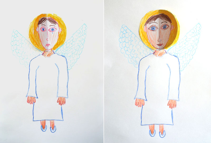Лик с меняющимся выражением легко сделать из двух кружочков бумаги, сложенных пополам и наклеенных таким образом, чтобы можно было перелистывать их, как страничку. Все ангелы много плачут, глядя на земные дела, но в наших силах и радовать своих небесных хранителей.