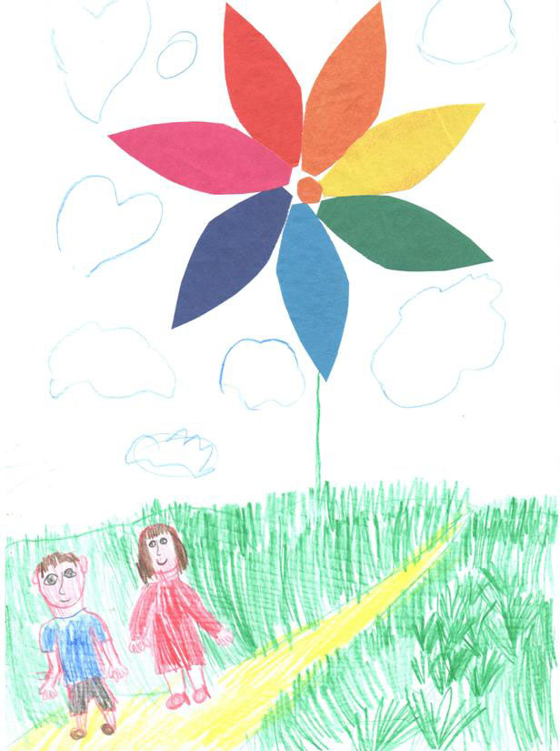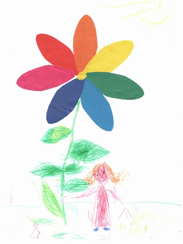 Поработаем сначала в технике аппликации. Сложим вместе семь разных листочков цветной бумаги и вырежем из них семь лепестков для волшебного цветика-семицветика. Вот так, буквально двумя движениями ножниц, и делается половина работы. Теперь остаётся приклеить наш цветик на лист белой бумаги и дорисовать девочку Женю, очень маленькую, но очень добрую. Цветик-семицветик на нашей картинке будет самым большим пятном, и это соответствует жанру иллюстрации, ведь образ чудесного цветка занимает в сказке центральное место.