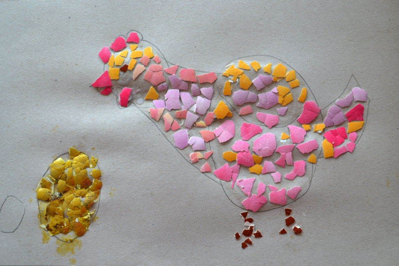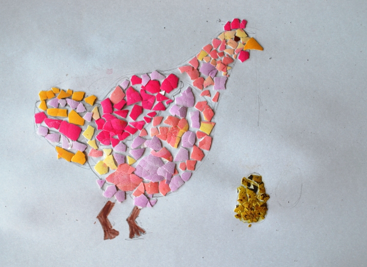 Старые сказки просты как гладкие камушки с берега реки. Лаконичные и простые повествования помнят наизусть все, кто хоть немного возился с малышами. И как мы не задумываемся о том, сколько раз водная стихия испытывала на прочность кусок камня, отсекая раз за разом всё лишнее, так и короткие сказки, которые известны нам дословно, обычно не вызывают вопросов об их сокровенном смысле. Между тем даже в стандартной сказочной затравке, в словах «жили-были дед и баба», содержится неимоверная плотность. Что такое «жили-были»? Иногда умудрённые житейским опытом мужи в шутку говорят молодым людям, дескать, ну ничего, первые десять лет в браке тяжело, но потом привыкаешь. И сразу с улыбкой в усах наблюдают расширенные от ужаса глаза. А в сказке всё наоборот: прикровенно и бережно, с кажущейся лёгкостью подаётся — «жили да были». Так в несколько слов и помещается долгая жизнь, все её праздники и будни, все трудности взаимного понимания, нехватка мудрости, денег, родившиеся и, дай-то Бог, благополучно выросшие дети, а также больные суставы, вредные соседи и старческая бессонница. Да вот ещё рябая курочка. То ли часть нехитрого хозяйства, то ли питомец, а то ли друг печальных дней. Читающий да разумеет. Чем же были наполнены дни, максимально приближенные к моменту, описанному в сказке о курочке Рябе? Вероятно, бабушка варила щи да жарила блины, а дед хозяйничал во дворе и в старом саду. Курочка исправно несла каждый день по яйцу, да нарушала тишину опустевшего родительского гнезда, простите меня за каламбур. Дети постаревшей четы в сказочном повествовании не упоминаются, поэтому можно предположить, что курочку держали прямо в избе именно для радости. Как жаль, что молодые тяготятся выслушивать бесконечные описания того, что старче покушал и от какой погоды у него не ломит костей. Рассказы пожилых родителей однообразны, жалобы стандартны, просьбы предсказуемы. Это совершенно не входит в круг интересов тех, кто не ощутил ещё на себе горечь немощи и пустоту одинаковости дней. Тех, кто не знает вкуса отчуждения от многообразия проявлений видимого мира, когда органы чувств отказываются служить как следует. Когда руки не держат, ноги не ходят, глаза не видят, уши не слышат, нервная система подводит, памяти нет. Вот и осталась нашим сказочным деду с бабой одна отрада и собеседница — курочка Ряба. Да так сроднилась со стариками курочка, что начала чудеса для них творить. И снесла она однажды к празднику золотое яичко. А давай, мать, попробуем разбить эту невидаль. А давай. Но нет сил в старческих руках; смотрит курочка из своего гнезда, наклонила голову и вот-вот вырвется вздох огорчения из рябого горлышка… Вот так праздник: не разбивается яичко, по-царски позолоченное! Не естся белоголовый кулич и «паска» преукрашенная. Где же вы, детки, выращенные-выпестованные? Достаньте ваши телефоны мобильные, заведите коней железных, поспешите да потрапезуйте с дедушкой и бабушкой! А не то золото праздника великого обратится буднями для ваших родненьких… Давайте изобразим курочку и её чудесное золотое яичко! Работать будем в технике мозаики, а материала для неё, уверена, сейчас достаточно в каждом доме – это яичная скорлупа. Разноцветная, сложенная кучками на столах, накрошенная под столами, ссыпанная в пакетики и совершенно беспризорная нарядная оболочка самого попу