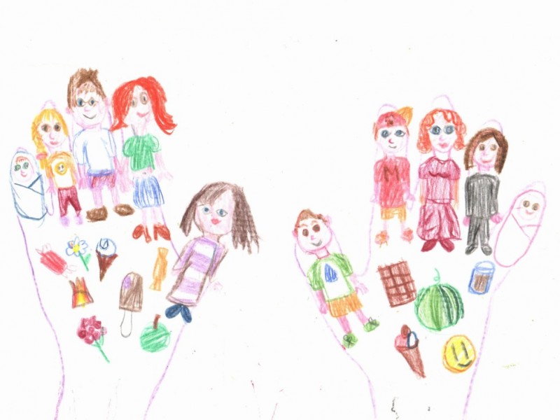 Давайте нарисуем дружную компанию ребят! Составить композицию помогут нам отпечатки детских рук. В первую очередь на листе А4 обведём пальчики маленького художника и дадим ему задание превратить каждый пальчик в портрет друга. Рисунок можно выполнять любым графическим материалом – карандашами, мелками или фломастерами. Тот пальчик, что повыше, пусть станет старшим товарищем, пальчик пониже – младшим.