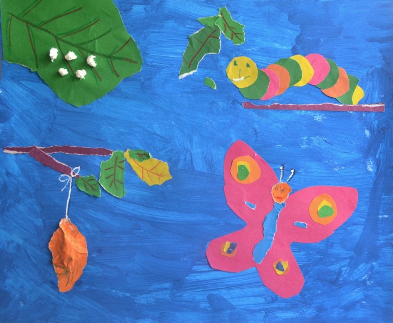 Насколько умилительно выглядит мама с младенцем, в столь же великой степени эту женщину можно назвать труженицей и подвижницей. Именно поэтому рождение детей страшит нас, но и вдохновляет, приносит в жизнь новые смыслы, позволяет чувствовать себя нужными и любимыми. Эти две чаши родительства — страха и вдохновения — положены на весы нашей личной жизни, профессиональной значимости, социальной активности и физической привлекательности. Сколько нужно отдавать и при этом оставаться собой, не растворяясь без осадка в ежедневных размышлениях на тему «как же сделать так, чтобы всем было хорошо»? Сколько необходимо нашего внимания и заботы, чтобы не лопалось наше терпение и не ломались личные границы ребёнка под напором любви? Хорошо быть кисою, хорошо собакою… Как известно, животные в целом не испытывают боли при рождении детёнышей. И только человек появляется на этот свет с болью и причиняя боль. А потом ещё долгие месяцы и годы заставляет лелеять и опекать своё взросление. А вот жирафик, например, рождается, выпадая из лона матери прямо на землю, и уже через несколько минут семенит к вымени своей долговязой родительницы. Или птенец, выбравшись из скорлупы, высыхает и уже — пожалуйста! — бегает около наседки. На зависть нам, наверное. И тем обиднее принять факт, что наша забота и наше терпение могут оказаться лишними, нежеланными, вредными, наконец. Думается мне, что пришло время сказки, а точнее притчи. Одному садовнику посчастливилось наблюдать за рождением бабочки. Она прожила в коконе достаточно долго и теперь превращалась из бездушной на вид куколки в прекрасное создание. Спящее до поры волшебство делало попытки выбраться на свободу; бабочка то двигалась, то замирала, будто бы не в состоянии продолжать борьбу. По чуть-чуть расширяя отверстие в плотно сотканной скорлупе своего временного жилища, она создавала о себе впечатление выбившегося из сил узника. Человек сидел и, затаив дыхание, ожидал окончания метаморфозы. Вскоре он забеспокоился. Садовник сделал предположение, что бабочке нужна его помощь. Тогда он взял ножницы, разрезал тонкую стенку кокона и осторожно освободил нежное тело и сложенные крылья бабочки: он ожидал, что через несколько минут крылья высохнут, расправятся, и красавица взлетит, радуясь вместе со своим освободителем. Но прошло немного времени, а потом ещё и ещё немного, но бабочка только ползала, волоча за собой безжизненные и бледные крылья, так и не раскрывшиеся и не показавшие миру своей красоты. Ведь для того, чтобы явить эту красоту, бабочке было необходимо проделать весь путь освобождения из кокона самостоятельно. Помощь человека принесла смертельный вред — не дала раскрыться крыльям чудесного насекомого, лишила полёта и радости целую жизнь, пресекла развитие бабочки в самом кульминационном его моменте. Пока вы смутно догадываетесь о выводах, к которым мы придёт в конце занятия, давайте последовательно нарисуем метаморфозы чешуйчатокрылого насекомого. Заодно расскажем детям, откуда берутся бабочки, через что они проходят, чтобы порхать с первых тёплых дней до самой осени. Для нашей работы нам потребуются: — Лист А4, клеёнка для защиты стола, — Гуашь синего цвета, жёсткая кисть, стакан-непроливайка, — Цветная бумага, белая салфетка, — Ножницы, клей ПВА и клей-карандаш, — Цветные карандаши, ручка-