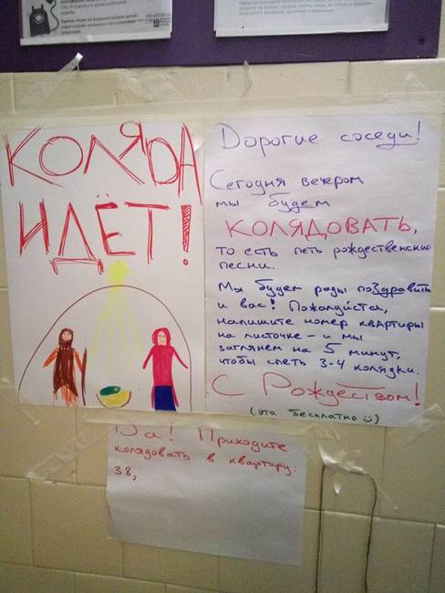 Рождество не должно пройти незамеченным. И мы изо всех сил стремимся добавить в наши суетливые рождественские выходные (работа, готовка, уборка, работа, погулять, насморк, понос, гости, погулять, работа) хоть что-то, связанное с праздником. Несколько лет назад мы придумали колядовать у себя в подъезде. Вешаем объявление за несколько дней — стараемся, как можем, показать, что мы не опасные чудаки, а, напротив, милые и приятные. Получается, кажется, не очень — с каждым переездом количеством откликов стабильно снижается. Хорошо, когда в колядовании участвуют гости — но на наши призывы в фейсбуке, как правило, откликается не более одного старого доброго друга. Но и один — это очень неплохо: с ним можно спеть на два голоса, сбагрить ему конфеты, чтобы не испортить окончательно животы и зубы, и успокоиться под вечер стаканом вина. Итак, напарника нашли, второй этап — репетиция, начало строго за час сорок пять до выступления. Каждый год мы мучительно пытаемся понять, что будет не слишком длинно и не слишком коротко, не слишком религиозно и не слишком светски, и при этом под стать нашим скромным вокальным способностям. В итоге приходим, кажется, каждый раз к одному и тому же списку: «Рождество Христово, ангел прилетел» — «Ночь тиха» — «В ночном саду» — «Добрый вечер, тоби» («Да не надо опять про шоколадки» — «Ну нет, прикольно же!»). Все не целиком, а по два-три куплета. Выступлению добавит живости обилие музыкальных инструментов, поэтому берем все, что хоть как-то годится в дело: гитара, флейта, бубен, маракасы, треугольник. И неважно, что неудобно таскать — главное, что есть чем занять руки в моменты мучительной неловкости. А-а-а-а, мы же забыли звезду! Где-то тут была картонная коробка, сейчас вырежем. Ну и что, что получилось 7 лучей — это неважно, и куда лучше, чем 5 или 6! Крепим на палку от швабры — и вперед. 3 этаж. — Нина Ивановна! Это Берхины из 38 квартиры, пришли вас поздравить с Рождеством! — Ребятки, дверь не открою, у меня грипп! — Ладно, мы так! Рождество Христово, ангел прилетел… 4 этаж. — Вот ангел им сказал о пастухах — сейчас придут, встречай! — Ой, спасибо! А у нас морская свинка живет, хотите зайти погладить? Труппа, перерыв. 6 этаж. — Здравствуйте, мы пришли вас поздравить с Рождеством! — А, это, наверное, жена у вас записалась. Нет, спасибо… 7 этаж. — А за ти коля-а-адки дайте на-а-а-м шоколадки! — Ой, а у меня угощения нет! Ну, возьмите хоть 50 рублей! 8 этаж. — В пеще-е-ере ослик — Анечка, ну пой с нами! — кушает овес… — Ой, какие же вы милые! Итого: в минусе сломанный маракас и бутылка красного сухого, в плюсе 2300 г конфет, 50 рублей чистой выручки. И чувство, что Рождество в нашей семье все-таки случилось. Фото обложки Андрея Ярыгина из личного архива автора