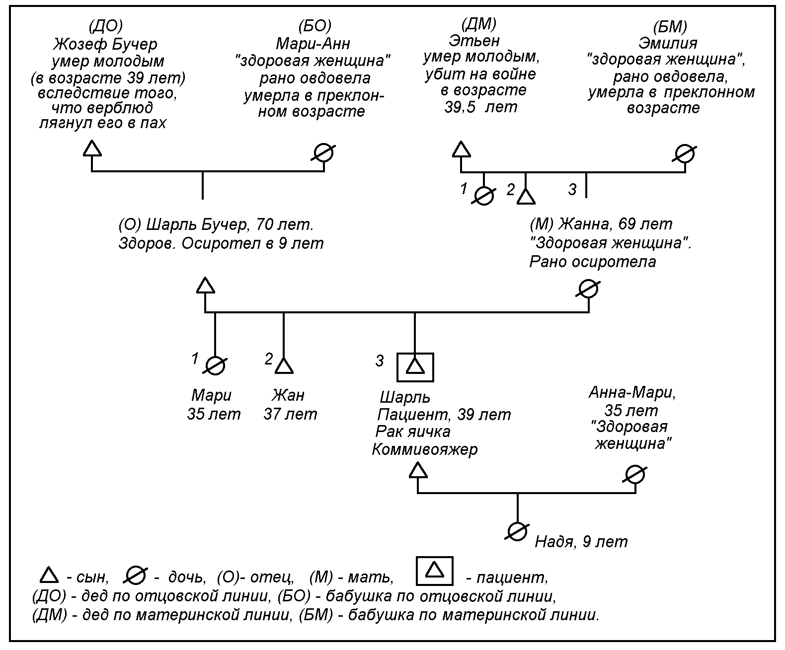 Мы на геносоциограмме указываем профессию, уровень образования, переезды и изгнания, а также некоторые патологии: родился раньше срока или с пуповиной на шее, или посредством кесаревого сечения (что сдвигает дату рождения и ее семейный смысл), рассеянный склероз, наследственные расстройства, психоз, умственную или физическую отсталость, тюремное заключение и т.д.