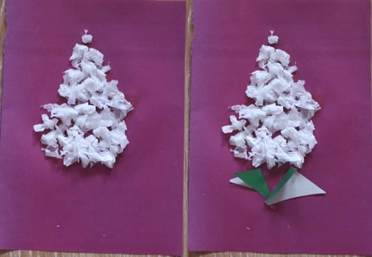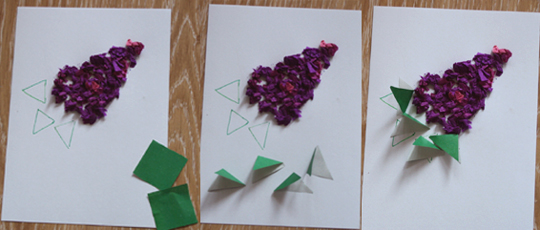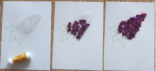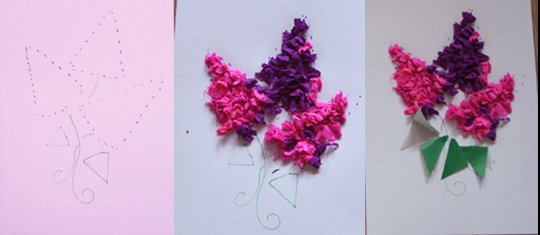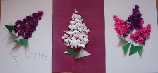 Аппликации из крепированной бумаги Мастер-класс для родителей Как много удивительных открытий несет нам весна! Как жизнерадостно поют птицы за окном, и как прекрасно цветение садов… Вдохновившись весенним обновлением, сегодняшнее занятие мы посвятим цветочной теме: сделаем бумажный букет сирени. Это занятие подойдет для детей от 3-х лет. Нам понадобятся: оформительская крепированная бумага или обычная тонкая цветная бумага белый картон формата А4 клей-карандаш фломастеры 1. Берем лист белого картона и намечаем на нем рисунок сирени. Соцветие сирени по форме напоминает треугольник. Поэтому пунктиром намечаем сиреневый треугольник в центре листа. Снизу рисуем листики: несколько небольших треугольников. Добавляем ножку сирени. 2. Разматываем рулон крепированной бумаги и отрезаем небольшой кусок. Разрезаем его на полоски шириной 2-3 см. 3. Теперь малыши смогут потренировать пальчики! Нужно разорвать каждую полоску пальцами на несколько частей и скатать кусочек в бумажные шарики. Каждый шарик станет цветочком, поэтому, чтобы наша сирень была пышной, шариков понадобится много. 4. Густо наносим клей-карандаш на сиреневый треугольник. 5. Берем бумажный шарик-цветочек и вдавливаем его в лист картона, там, где нанесен клей. Шарик частично приклеится, но основная его часть будет оставаться пушистой и объемной. Таким же способом прикрепляем все цветочки. Снизу соцветия сирени приклеиваем цветочки покучнее и погуще, к верхушке – меньше. Готово? Осторожно распушим шарики пальцами, чтобы аппликация стала пышной. 6. Вырезаем из зелёной бумаги несколько квадратов. Разрезаем их пополам, сгибаем и приклеиваем одним краем к листу картона. 7. Подрисуем зелёным фломастером сирени ножку, добавим надпись. Аппликация готова! Белая сирень Белая сирень выглядит особенно нежно. Её мы сделали таким же способом, но на бумаге фиолетового цвета (на тёмном фоне она смотрится более контрастно). Сиреневый букет Ребятам постарше мы предложим собрать целый букет сирени: 1. На листе картона наметим схему букета: несколько треугольников сирени, листочки. 2. Возьмем креповую бумагу фиолетового и розового цвета, повторим то же, что и для одной веточки. 3. Чтобы букет смотрелся объемнее, добавим в фиолетовую кисточку несколько цветочков розового цвета. А в розовые кисточки – наоборот, три-четыре фиолетовых цветочка.