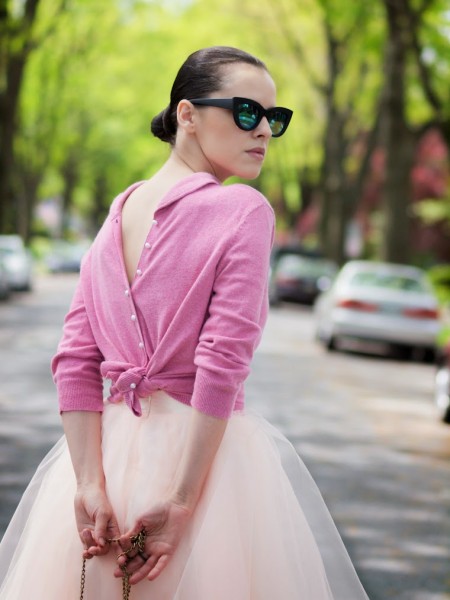 На мой взгляд, гениальная идея для тех, кто хочет, чтобы торс, и особенно ноги, не выглядели короткими, а выдающиеся бедра не были визуально столь выдающимися. Трикотажные топики, кардиганы, маечки, сколько таких вещей в наших шкафах, с которыми можно поэкспериментировать, надев их задом наперед. Попробуйте, это довольно занятно. И если вам понравится, смело отпарывайте этикетки, и дарите своим вещам новую жизнь. Этот прием не только стройнит, но и вносит разнообразие в гардероб. Для миниатюрных женщин, как я, эта идея настоящий подарок. Не любой трикотаж подчинится этой идее, но, из моего опыта, большая его часть.