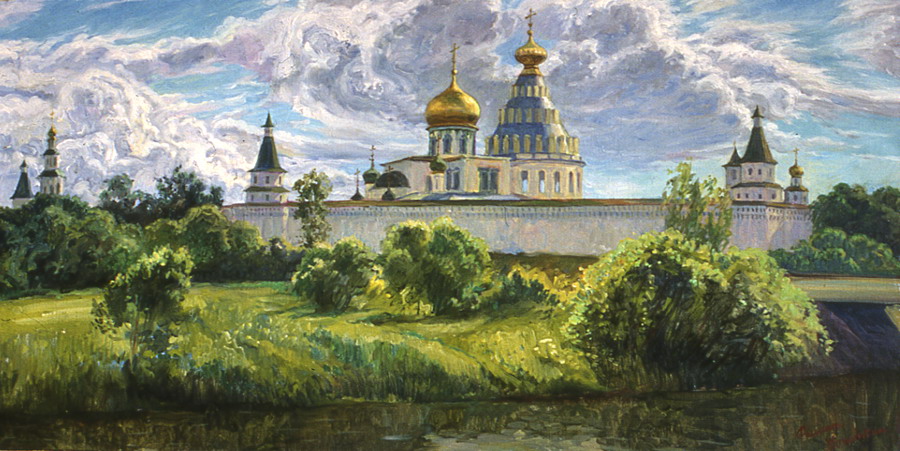 Конечно же, речь пойдет о Новом Иерусалиме – монастыре, основанном патриархом Никоном неподалеку от современного города Истра. Лучшее описание дороги к монастырю – здесь (да и вообще на этом портале много актуальной информации). От себя добавлю, что пешая прогулка от станции Ново-Иерусалимская до обители занимает примерно полчаса. Также посоветую отправляющимся в паломничество позаботиться о «хлебе насущном»: в самом монастыре ничего съестного не продается, а в качестве питья – только вода из святых источников. Горячий чай можно купить, например, в палатке у автостанции, а пирожки и фрукты – в супермаркете по дороге (он упоминается в описании). Это, кстати, тот редкий случай, когда название полностью соответствует сути – ассортимент очень приличный. Наконец, предупрежу: в монастыре реставрация. Так что если хотите увидеть его во всем блеске – придется приехать лет через пять (по плану работы завершат в 2017 году). Пока же обитель порадует не столько благолепием, сколько возможностью порассматривать строительные технологии как 17-го, так и 21-го веков. И помолиться, конечно. Мужской Воскресенский Ново-Иерусалимский монастырь был основан патриархом Никоном в 1656 году. Его замысел перекликался с популярной в середине 17 столетия идеей «Москва-Третий Рим». Обитель должна была стать городом-храмом, крупнейшим центром всего православного мира, воссоздающим образ Святой Земли. «Новым Иерусалимом», по одной из версий, монастырь впервые назвал царь Алексей Михайлович, побывавший здесь в 1657 году на освящении деревянной Воскресенской церкви. Филипп Москвитин «Новый Иерусалим» Топонимика монастырских территорий повторяет названия святых мест Палестины: река Истра здесь переименована в Иордан, вблизи монастырских стен журчит Кедронский поток, холмы вокруг – Елеонский и Фаворский. Также и храмы здесь расположены и названы по образу Иерусалимских. Огромный одноглавый крестово-купольный Воскресенский собор построен по образу главной христианской святыни — храма Гроба Господня в Иерусалиме, к нему пристроены шатровая часовня Гроба Господня, Успенская церковь и подземная церковь святых Константина и Елены. В соборе воспроизведены подобия горы Голгофы, пещеры Гроба Господня, места погребения и воскресения Иисуса Христа. Большая часть монастыря построена в конце 17 века. Над главным храмом трудились в разное время Карл Бланк, Бартоломео Растрелли, Матвей Казаков, Андрей Воронихин, Константин Тон. В конце 19 века — начале 20 века монастырь стал важным центром паломничества (число богомольцев особенно возросло после постройки Рижской железной дороги). К 1913 году в Воскресенский монастырь ежегодно приезжали около 35 тысяч паломников. В 1919 году монастырь упразднили, открыв здесь историко-архитектурный и художественный музей «Новый Иерусалим». Также большую часть территории подмосковной Палестины сейчас занимает город Истра. Больше всего монастырь пострадал не в революцию, а во время Великой Отечественной войны. В течение двух недель территория, на которой находится монастырь, была оккупирована. Уходя, фашисты заложили две авиабомбы и несколько тонн взрывчатки в Воскресенский собор, взорвали его, а также колокольню и башни. С тех пор монастырь пытаются восстановить. Реставрация началась еще во время войны, в послевоенные годы ей руковод