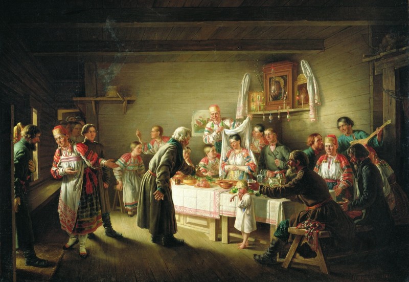 Свадебные обряды на Руси — очень интересная тема. О том, как проходила собственно свадьба, мы уже говорили. Теперь предлагаю поговорить о том, как проходила подготовка к свадьбе и главная часть этой подготовки — сватовство. Несмотря на то, что брак на Руси всегда считался делом добровольным, молодых часто женили против их желания, руководствуясь меркантильными интересами: объединить соседствующие наделы, взять хорошее приданое либо просто — привести в дом работящую бабу. Как отмечали историки, часто родители отдавали своих дочерей попросту за того, кто предложит больший выкуп, иногда лишних два-три рубля решали судьбу девушки. Нередко жених и невеста впервые виделись на смотринах. Бывало так, что сговаривали из своих личных выгод совсем маленьких детей, лет по 6-7. В таких случаях свадьба игралась, когда жених и невеста входили в брачный возраст. Бывали и вовсе вопиющие случаи, например, известно, что некий крестьянин писал прошение о разводе по той причине, что его шестилетним сговорили с невестой 27 лет, а затем и обвенчали. Жена, пользуясь малолетством жениха, била его, а когда молодой человек пришел в совершеннолетний возраст, то жене его было уже под 40 — по тем временам она уже была глубокой старухой, не способной к деторождению, в связи с чем молодой человек и просил благословения развестись. Но так дела обстояли не везде. Во многих случаях родители все же стремились учесть пожелания своих детей и засылали сватов к уже примеченным девушкам. При этом во многих губерниях сватали только тех невест, которые изъявляли свое желание вступить в брак. Делалось это так: на именины девушка вставала на лавку, а на полу раскладывали кругом пояс и сарафан, либо поневу — женскую юбку. Отец, а за его неимением старший брат или старшие женщины в семье предлагали ей вскочить в сарафан или в пояс. Бывало, что девка, по обычаю, расхаживала по лавке туда-сюда, а мать ходила за нею с поневой или сарафаном, приговаривая: «Вскочи, дитятко, вскочи, милое», на что дочь должна была отвечать: «Захочу— вскочу, захочу — не вскочу!», но в итоге все равно девушка обычно прыгала в этот сарафан. Это было то же самое, что сейчас на сайте «ВКонтакте» вывесить статус «В активном поиске». Главное было — не промахнуться, в противном случае выход замуж откладывался на год, до следующих именин. Сватовство на Руси — большая и тщательно продуманная церемония, призванная уладить все хлопоты, связанные с приготовлением к свадьбе. Во время сватовства не только «сговаривали» невесту — добивались согласия родителей девушки на брак, но и обсуждали состав и количество приданого, выделение семье земельного надела, место жительства молодых, день свадьбы. Огромную роль во всем действе играли так называемые свахи — женщины, имеющие житейский опыт и отличающиеся умением договариваться, как сказали бы сейчас — коммуникабельные. При этом в одних губерниях непременным условием было, чтобы сваха не была родственницей предполагаемых жениха с невестой, в других — напротив, свахами звали исключительно родственниц. Труды свах были не безвозмездными: в случае удачного сговора, она получала денежное вознаграждение от родителей жениха. К. Маковский, «Сваха», 1900-е Сватовство начиналось задолго до самого бракосочетания. Мастерство свахи можно смело отнести к роду профессии. Свахи помимо 