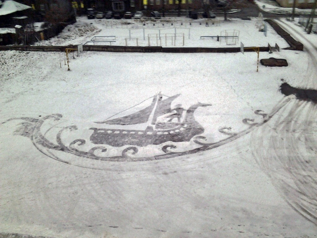 8. Простой ижевский дворник решил выделиться из толпы более оригинальным способом, чем эпатажный рокер. Он стал рисовать картины… метлой на снегу. Изображает кареты и корабли, жирафов и пальмы, красоты и чудеса. На создание шедевра уходит около получаса, занятия искусством не мешают основной работе, а жители Ижевска гордятся своим земляком.