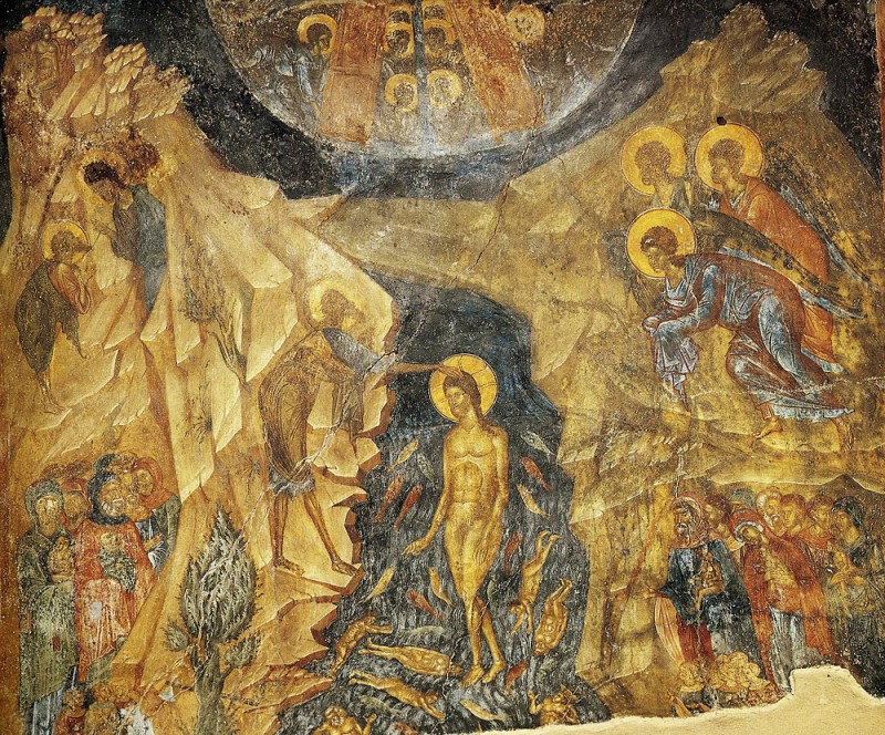 Особый праздник, которое иначе называется «теофания» (от греч. Θεος «Бог» и φαινω «являю»), присутствует практически во всех религиях. Он описывает событие, когда божество предстает перед людьми либо в телесном виде (человека или иного живого существа), либо в форме природных явлений. Первое было особенно свойственно эллинистическим культам (хотя и там Зевс принимал вид золотого дождя или облака), второе – иудаизму. Христианство вобрало в себя обе традиции. Первое время, когда в общинах преобладали евреи, всё внимание уделялось искупительной жертве Христа, а не событиям Его земной жизни. В этой связи рождение Иисуса никак не отмечалось. Для эллинов же само воплощение Бога в человеческом теле было знакомым и важным явлением. Жители Балканского полуострова издревле поклонялись Аполлону, проводя в честь его рождения – теофании – пышные церемонии в Дельфах. Под их влиянием Рождество Христово постепенно приобрело значимость. Эти представления возникли во II в. н.э. в среде гностиков. Первоначально праздник объединял несколько событий: рождение, поклонение волхвов, крещение, первое чудо в Кане Галилейской, — и праздновался 6 января. В 451 г. Халкидонский собор постановил отмечать Рождество и Богоявление отдельно. Рождество обрело новую дату — 25 декабря, заместив языческие празднования в честь Солнца. В день Богоявления вспоминали Крещение и поклонение волхвов. Однако, несмотря на многовековое разделение, у многих народов, в том числе и на Руси, эти два праздника воспринимались родственными. Многие обычаи Крещенского сочельника повторяют рождественские. Рождество и Богоявление связаны 12-дневными святками, история которых уходит корнями, пожалуй, в еще дописьменную эпоху. Каждый народ, воспринимавший эту традицию, осмыслял ее по-своему, но мы легко можем проследить общие моменты. Если для католиков Богоявление – это поклонение волхвов, то в православии Богоявление стало тождественно Крещению и знаменует событие, когда Господь явился во всей полноте: Бог Сын крестился телесно, Бог Дух Святой спустился в виде голубя, Бог Отец говорил с небес. Войдя в Иордан, Христос освятил само естество вод, превратив их из простой пищи в инструмент духовного очищения. Многие обряды и традиции этого дня связаны с водой. Крещение Господне; Византия. XIV в В наши дни Великое водосвятие совершается дважды – накануне и в сам день Крещения. Весь приход идет крестным ходом на «иордань», ближайший источник. На Руси, известной холодной погодой вообще, и крещенскими морозами в частности, во льду вырезалась прорубь в виде креста. Иногда над прорубью устанавливали сень, которая обычно возвышалась над алтарем или троном. Единственная сохранившаяся Иорданская сень конца XVII в. хранится в суздальском музее. Иорданская сень в праздник Крещения на реке Каменка в Суздале. Здесь следует заметить, что так было не всегда. «Обряд великого водоосвящения возник из обычая крестить накануне Богоявления оглашенных. Самая молитва богоявленского водоосвящения взята из обряда крещения и есть не что иное, как позднейшая ее переработка. Поэтому древнейшие известия приурочивают обряд богоявленского водоосвящения к вечеру и ночи накануне этого праздника, а не к самому дню Богоявления. Этот обычай однократного освящения воды накануне Богоявления держался до XI-XII века и затем п
