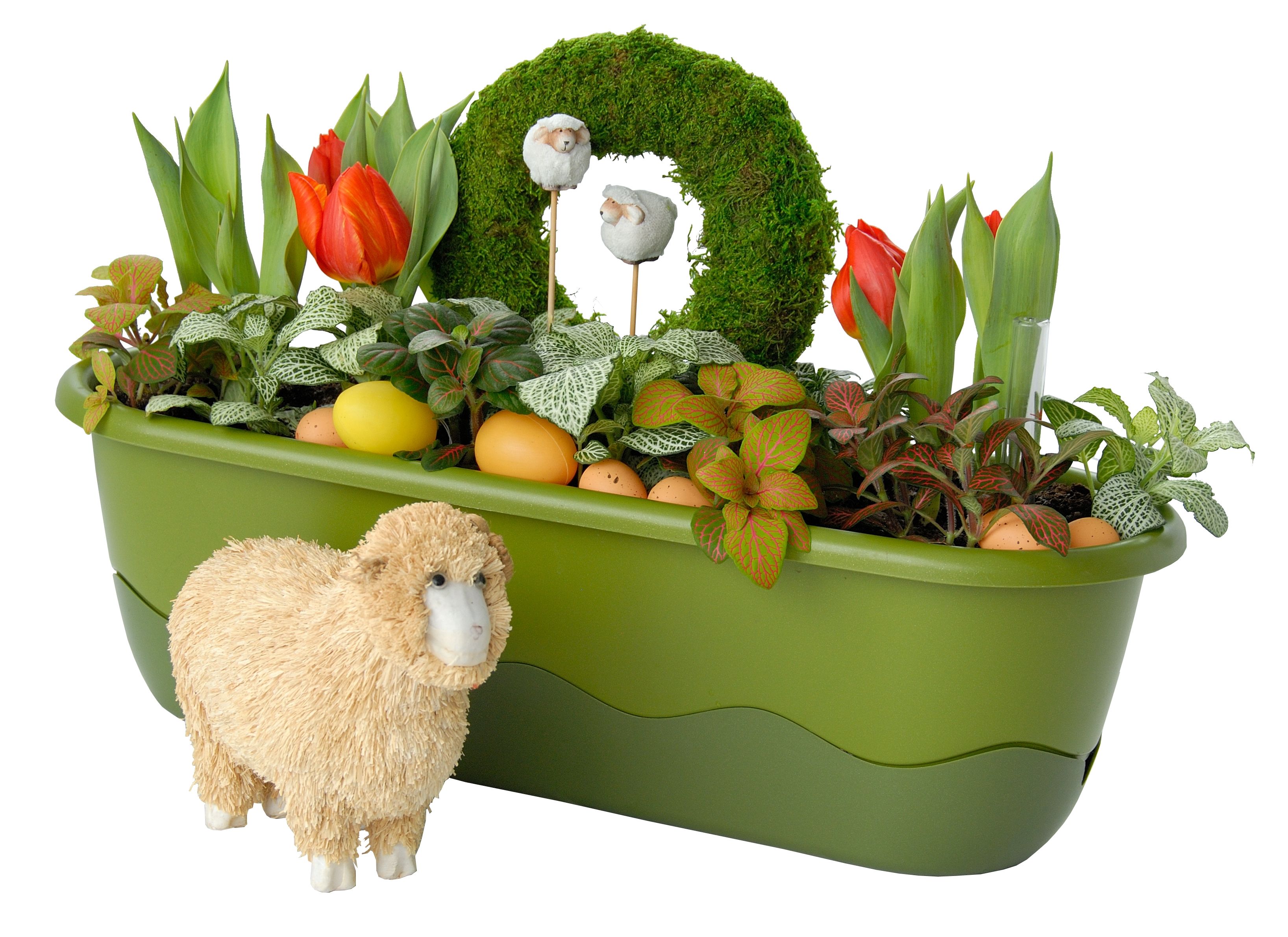 На сочные зеленые ростки люди клали заранее покрашенные яйца, а также ставили цветные фарфоровые и деревянные фигурки птиц и зверей. Получался своеобразный миниатюрный садик, который радовал детей и взрослых яркими красками. Вы можете использовать вместо ящика длинный горшок — эффект будет тот же самый. Это пасхальное украшение вашего дома напомнит о пришедшей весне и пробуждении всего живого.