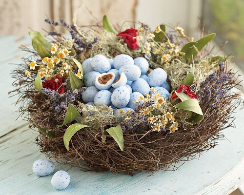 В день Светлой Пасхи дом обязательно украшается искусственными, а еще лучше — засушенными цветами. Конечно, многие предпочитают живые цветы, однако именно такова традиция. Помимо цветов в ход на Руси шли и букетики, состоящие из засушенных ягод, а также цветные ленты пастельных тонов, раскрашенные перышки и ракушки, всевозможный мох, хвоя, ветки, лоза, зелень. Из всего этого сооружались венки на дверь, гнезда, гирлянды и букеты…