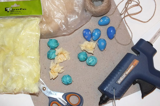— Декоративные детали (перышки, яички, искусственные цветы, рафия — из нее скручиваем клубочки, кружево);