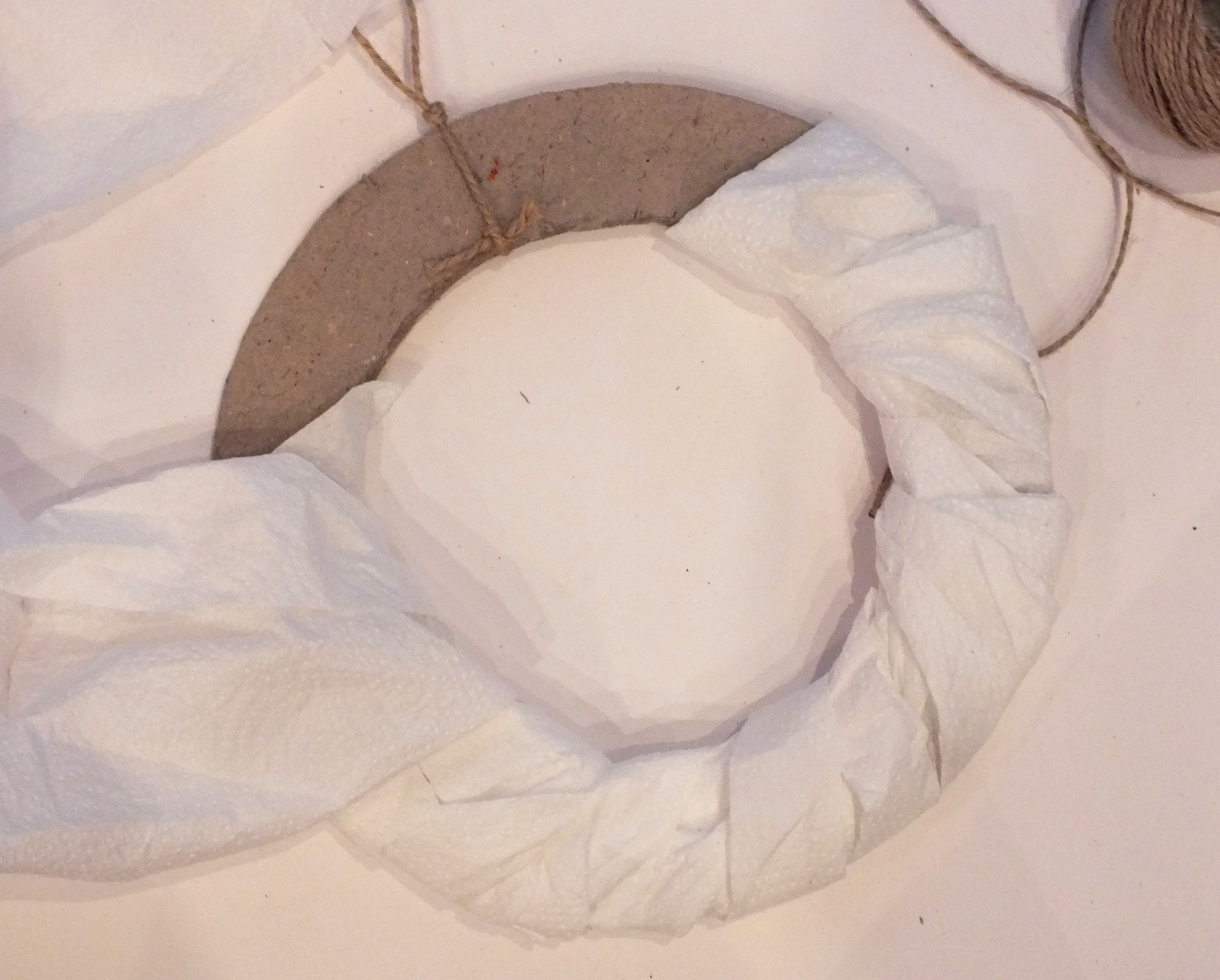 Вырезаем из картона заготовку для венка; у меня диаметр — 23 см, потом он немного увеличится. Для того, чтобы веночек был более объемным, оборачиваем заготовку кухонными полотенцами.