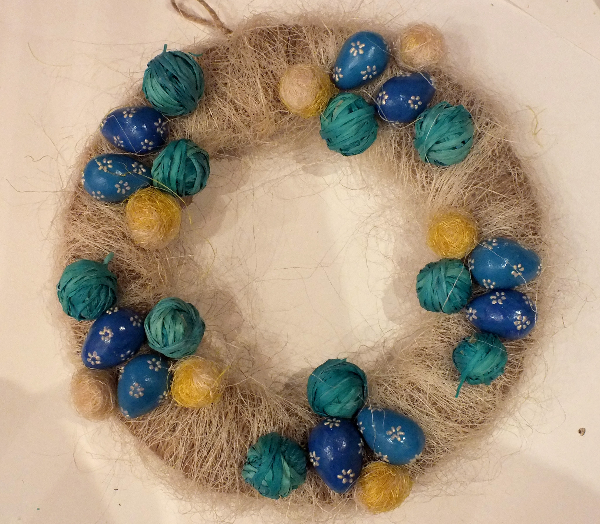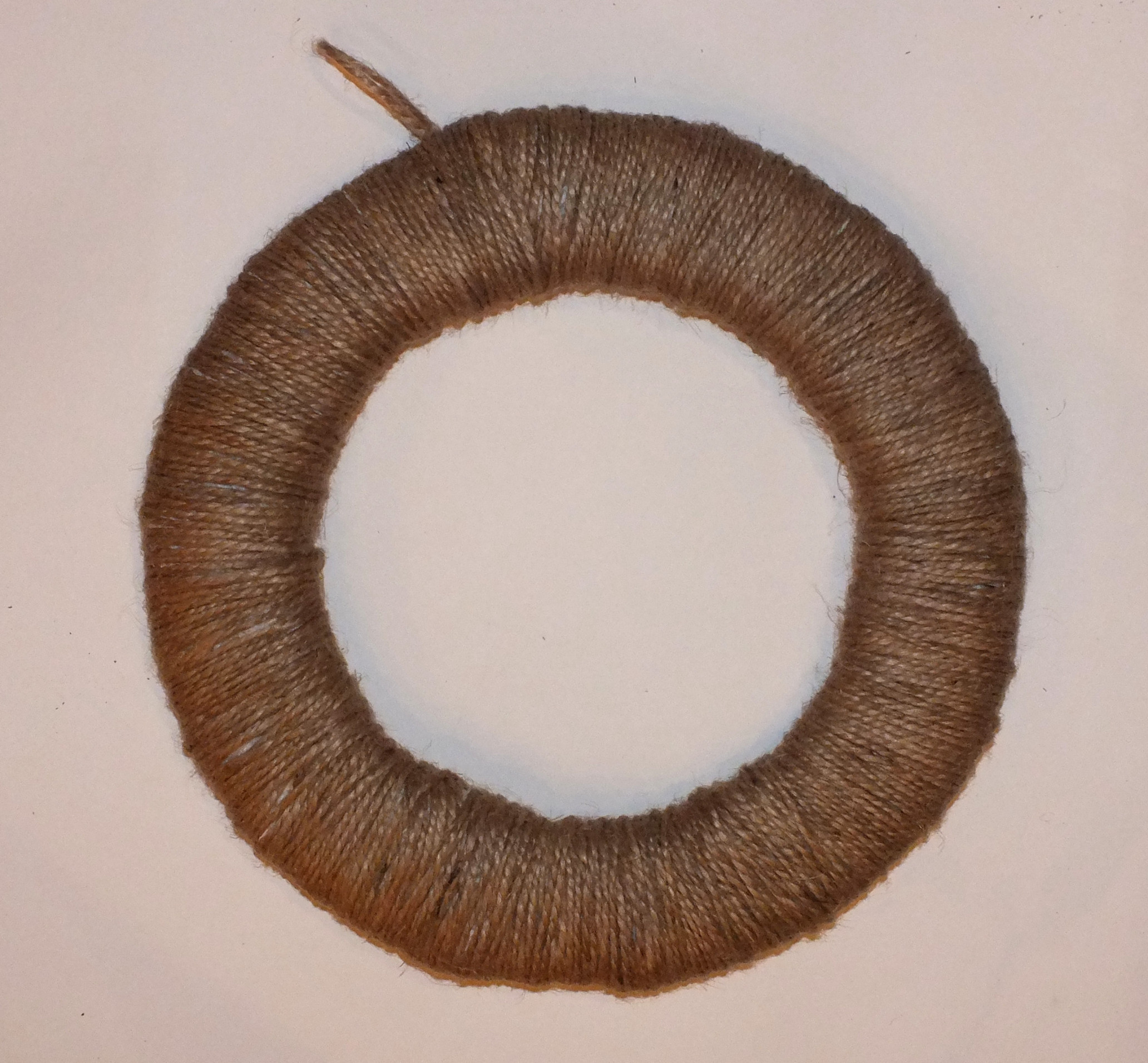 Далее оборачиваем джутовым шнуром — занятие довольно нудное, но необходимое. Из джута же формируем петельку для подвеса веночка. Можно вместо шнура использовать толстые нитки или ленты.