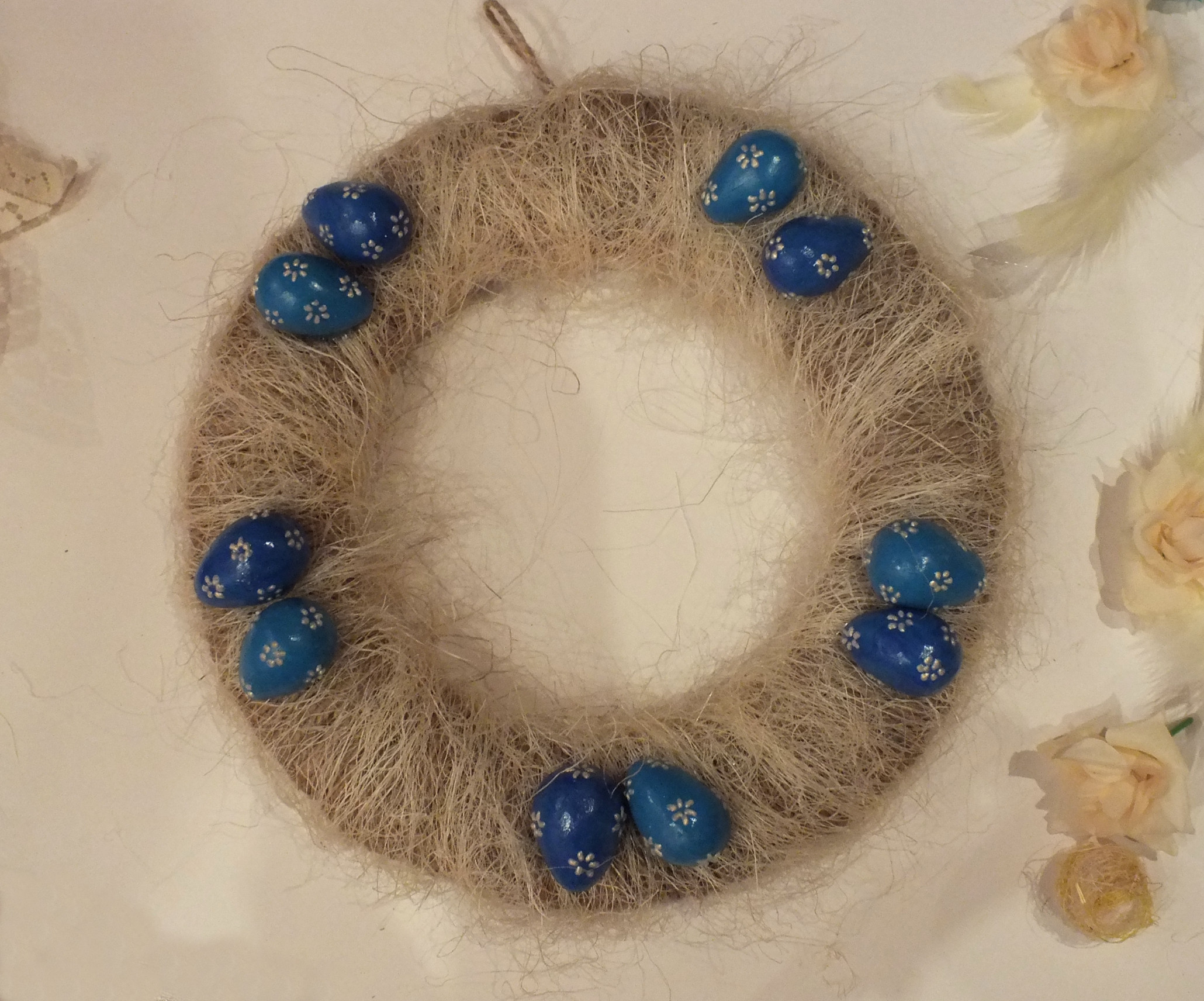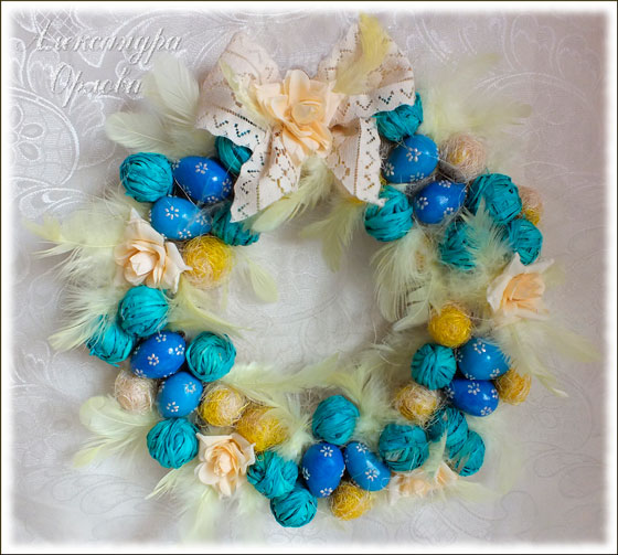Я использовала маленькие пасхальные яички (готовых не было, пришлось самой лепить из пластики и запекать, но этот пункт можно опустить, так как сейчас в магазинах продается достаточно разнообразного декора), розочки из ткани, перья, шарики из рафии, скрученные в клубочек (для данных целей вполне подойдут старые нитки из «бабушкиного сундука», а также кружево, которое я завязала в пышный бант.