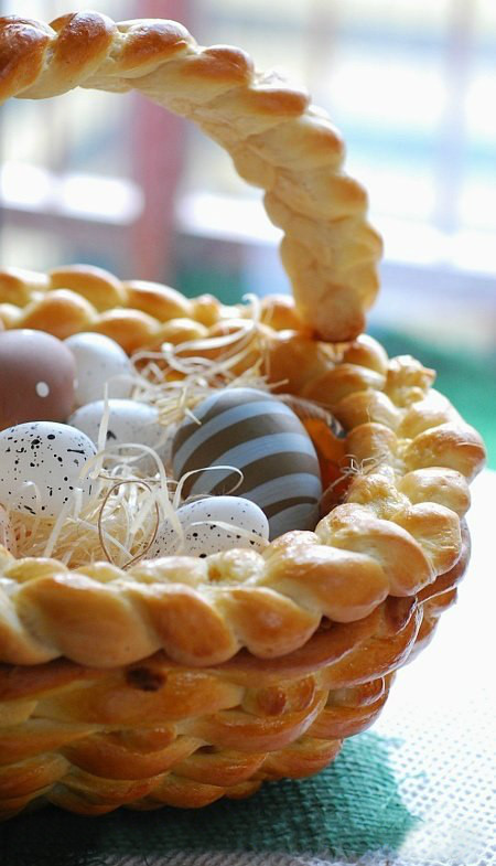 Украшение дома к Пасхе не обойдется без пасхальных корзинок. Их дно выстилают слоем земли и вставляют стебли весенних живых цветов. Чтобы продлить корзинке жизнь, можно использовать цветы в горшочках, они не завянут через несколько часов и будут радовать хозяев и гостей дома своей красотой. Также используют и искусственные растения. Далее такую композицию оформляют пасхальными яйцами, веточками вербы, лентами и цветными бантами. При этом желательно выдержать единую цветовую гамму или же играть на контрасте цветов.