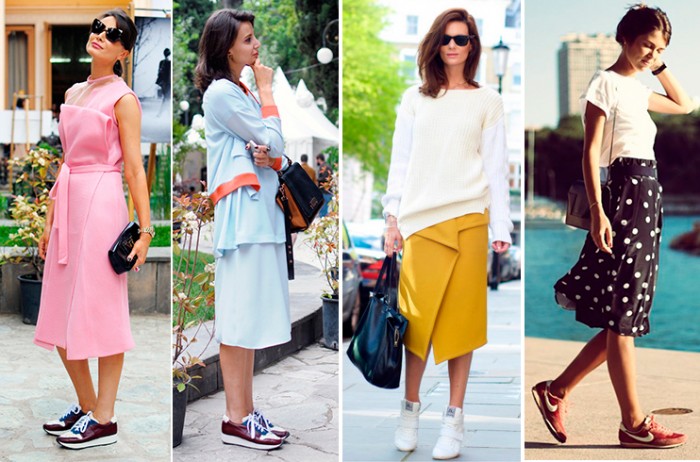 Это сочетание не только современный модный тренд, но и очень удобный выбор для повседневной жизни и для тех, кто не жалует, по разным причинам, каблуки. Кроссовки понижают градус нарядности вашего образа, и получается своеобразный микс из женственности и комфорта. Спортивный шик. В таком наряде можно целый день провести на ногах и всё равно чувствовать себя бодрой. К тому же кроссовки могут вдохновлять на занятия спортом и долгие прекрасные прогулки.