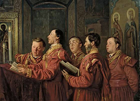 Итак, дорогие дамы, мы, как обычно, и оглянуться не успели, как снова наступают выходные. Наступают, разумеется, не для всех, церковным певчим, как всегда, желаю мужества и стойкости. Ребята, крепитесь и думайте о понедельнике. Если на понедельник не выпадет какой-нибудь праздник или ваша очередь на будничном клиросе, то у вас будет шанс поехать на вашу светскую работу прямо из дома, а не с ранней литургии. Но не будем о грустном… в смысле, о весёлом. Я оговорилась. Вам послышалось. Привиделось. Не могла я такого сказать. Разумеется, пение на клиросе – это праздник, а особенно когда шесть-семь служб подряд, причём одна из них ночная (а между ними, для приятного разнообразия, ещё парочка светских работ). Так что, не за что меня на поклоны ставить. Я хорошая. Ну так вот, о чём бишь я… А, ну да, у нас там лошадь с прошлого раза зависла. Не совсем, в общем, зависла, судя по комментариям (я их внимательно читаю, да), но… пусть ещё немного повисит, мне сейчас про другое хочется. Как-то навеяло воспоминаниями о суровом церковнопевческом пути. Клирос, чтоб все знали, кто ещё не в курсе, народная молва почитает за место опасное, искусительное и сугубо неблагочестивое. Ходила даже раньше такая шутка, особенно среди старушек, что, мол, если нас будут бомбить, то первая бомба угодит прямиком туда, где хор стоит. И правильно, давно пора: они там «слишком много знают»… Ну, допустим, некоторые из нас действительно знают слишком много и совсем не того, от чего улучшается характер и поднимается настроение. Но отдельные особи, вопреки распространённым приходским суевериям, интересуются также непосредственно тем, что входит в круг их певческих обязанностей. Ибо на клиросе, кроме свежих сплетен, можно почерпнуть и нечто такое, что весьма затруднительно почерпнуть в любом ином месте. Хотя теперь Премудрый Интернет рулит, но ещё лет пятнадцать тому узнать житие, например, преподобной Кассии, известной церковной поэтессы, можно было только из богослужебных книг. В тогдашних Минеях после каждой службы следовала краткая житийно-историческая справка. Чтобы служащие, если им вдруг станет интересно, с какой радости они нынче снова здесь собрались, могли удовлетворить своё похвальное любопытство. Поскольку паузы на Литургиях, благодаря наплыву исповедников, иногда стремятся напомнить нам о вечности, свободного времени для самообразования у певчих часто бывает навалом. Хватило бы житий на наш печальный век. Маковский Владимир Егорович «Певчие на клиросе» И хотя истории жизни, подвигов и страданий в служебных Минеях изложены примерно таким же живым и увлекательным языком, как протоколы заседаний епархиальных советов, некоторые из них всё равно берут за душу и повергают в длительные раздумья о самых неожиданных аспектах бытия. Житие преподобной Кассии – как раз из таких. Если вкратце… Нет, вкратце не получится. Я неоднократно пыталась пересказывать эту историю в двух предложениях, но уже со второго начинала волноваться, размахивать руками и пороть отсебятину. Сегодня, ради праздника встречи с вами, дорогие коллеги, я, пожалуй, начну сразу. Тем более, что даже Премудрый Интернет хранит не один вариант, а что там было в реале, мы сможем теперь доподлинно узнать разве что при личной встрече со всеми фигурантами. В общем… В общем, жил-был один византийский император. Молодой, 